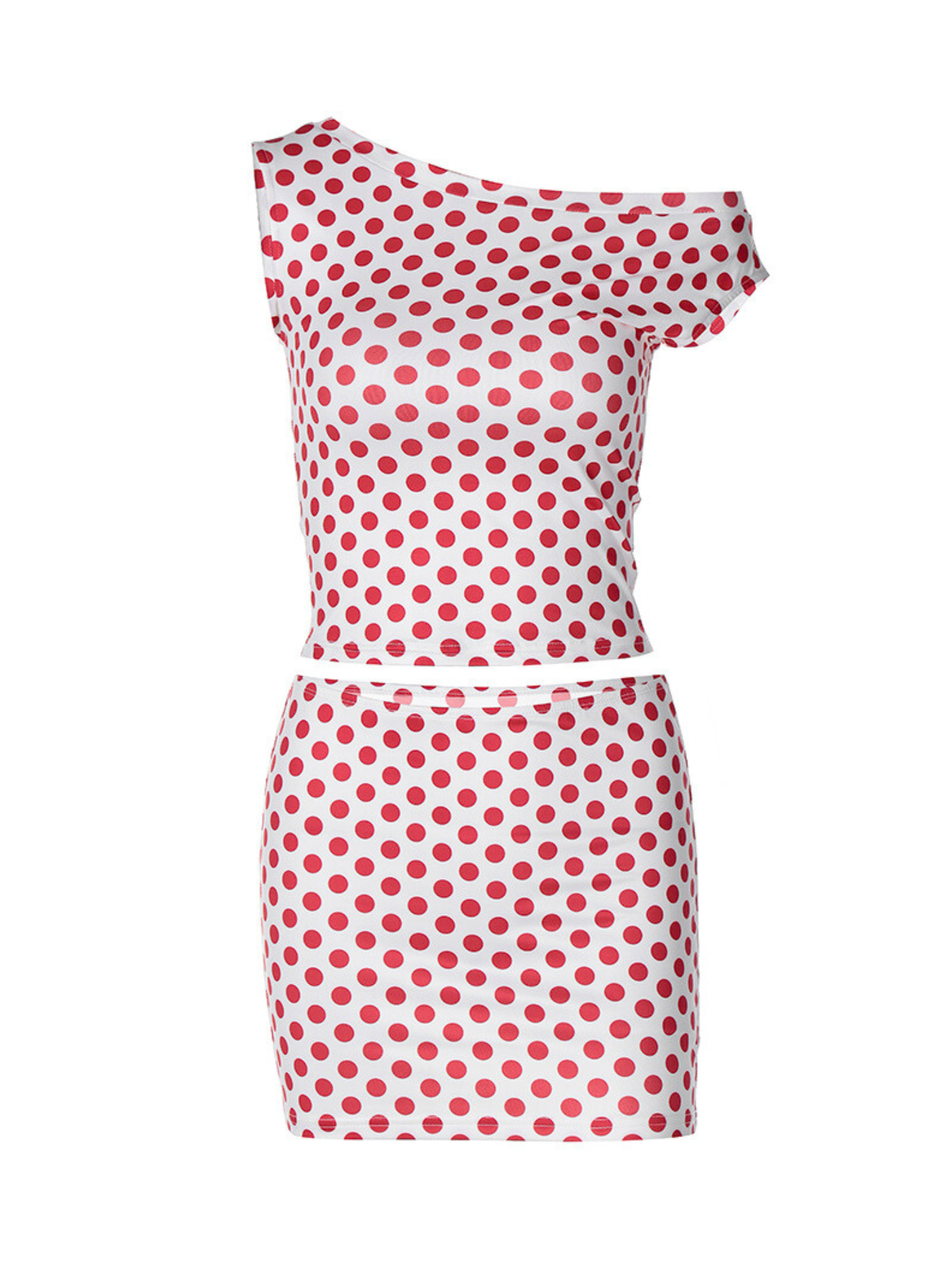 Turn heads in the Charlotte Polka Dot Off-Shoulder Skirt Set. a fun and flirty two-piece look inspired by vintage charm with a modern twist. The off-shoulder crop top features a bold asymmetrical neckline. while the matching high-waisted mini skirt hugs your curves in all the right places. The playful red polka dots on a crisp white base make this set a standout for summer days. vacations. or retro-inspired outings.