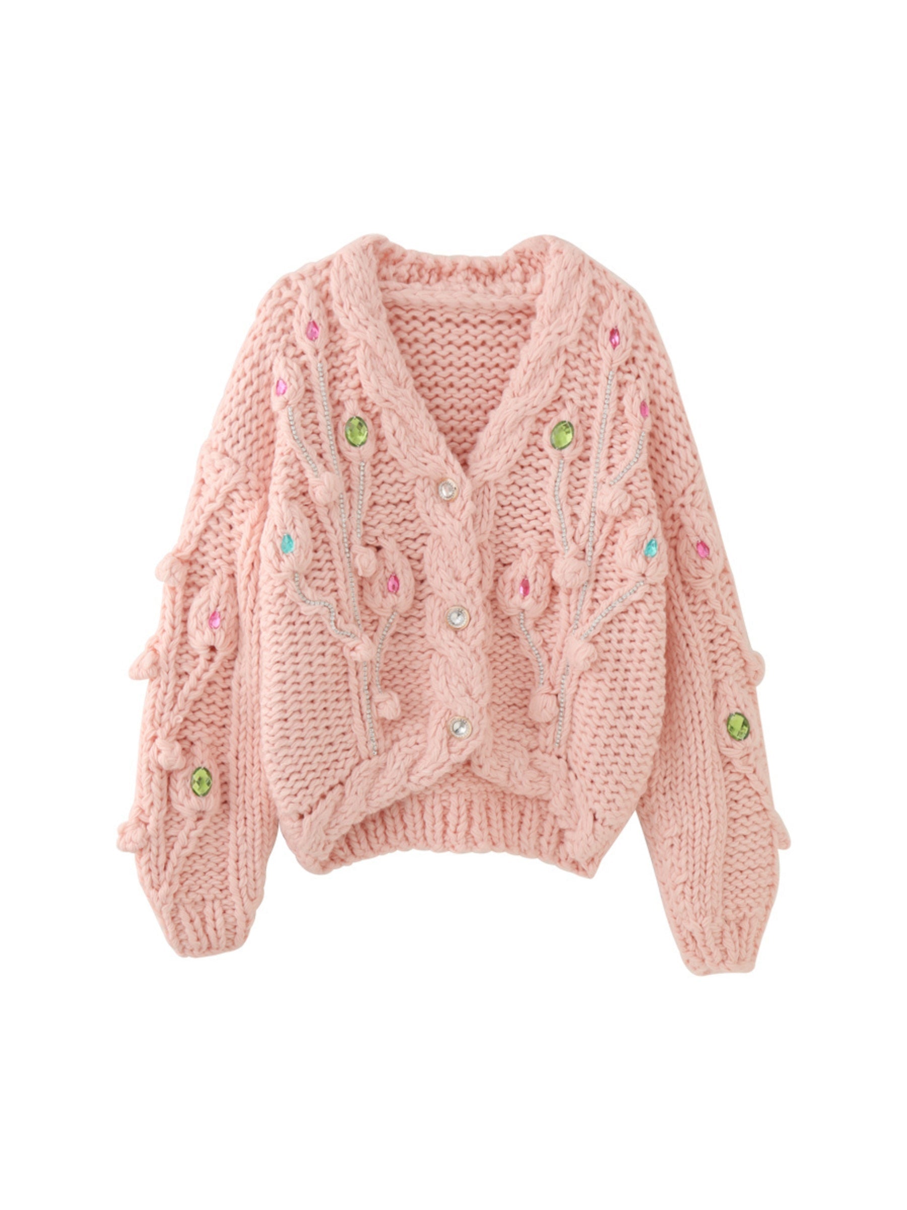 Add a playful twist to your winter wardrobe with the Emilia Embellished Knit Cardigan. This cozy cardigan is adorned with colorful jewel-like accents that add a fun. eye-catching detail to the chunky knit texture. The luxurious warmth of the thick fabric combined with the intricate designs along the sleeves and front makes it a unique and stylish piece for the colder seasons. Perfect for layering over casual or semi-formal outfits. Emilia ensures you stand out while staying comfortably warm.