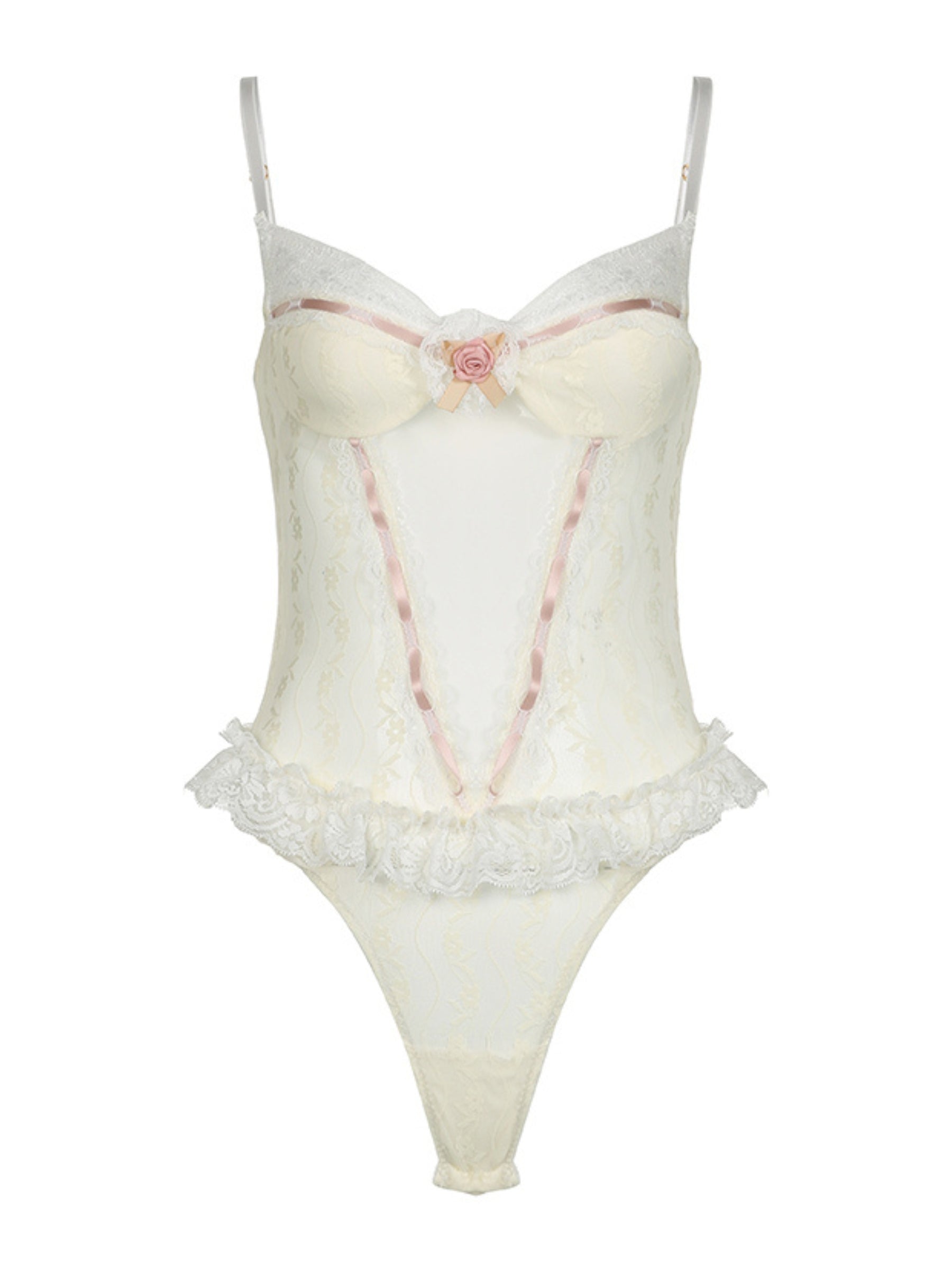 Introducing the Giana Lace Bodysuit in White from the Izosu Modern Romance Collection. This one-piece features a floral detailed neck and ruffle lace waist for a romantic and elegant look. The slim fit and mesh top add a touch of sexiness. making it perfect for any French-style outfit. Available in both white and black.