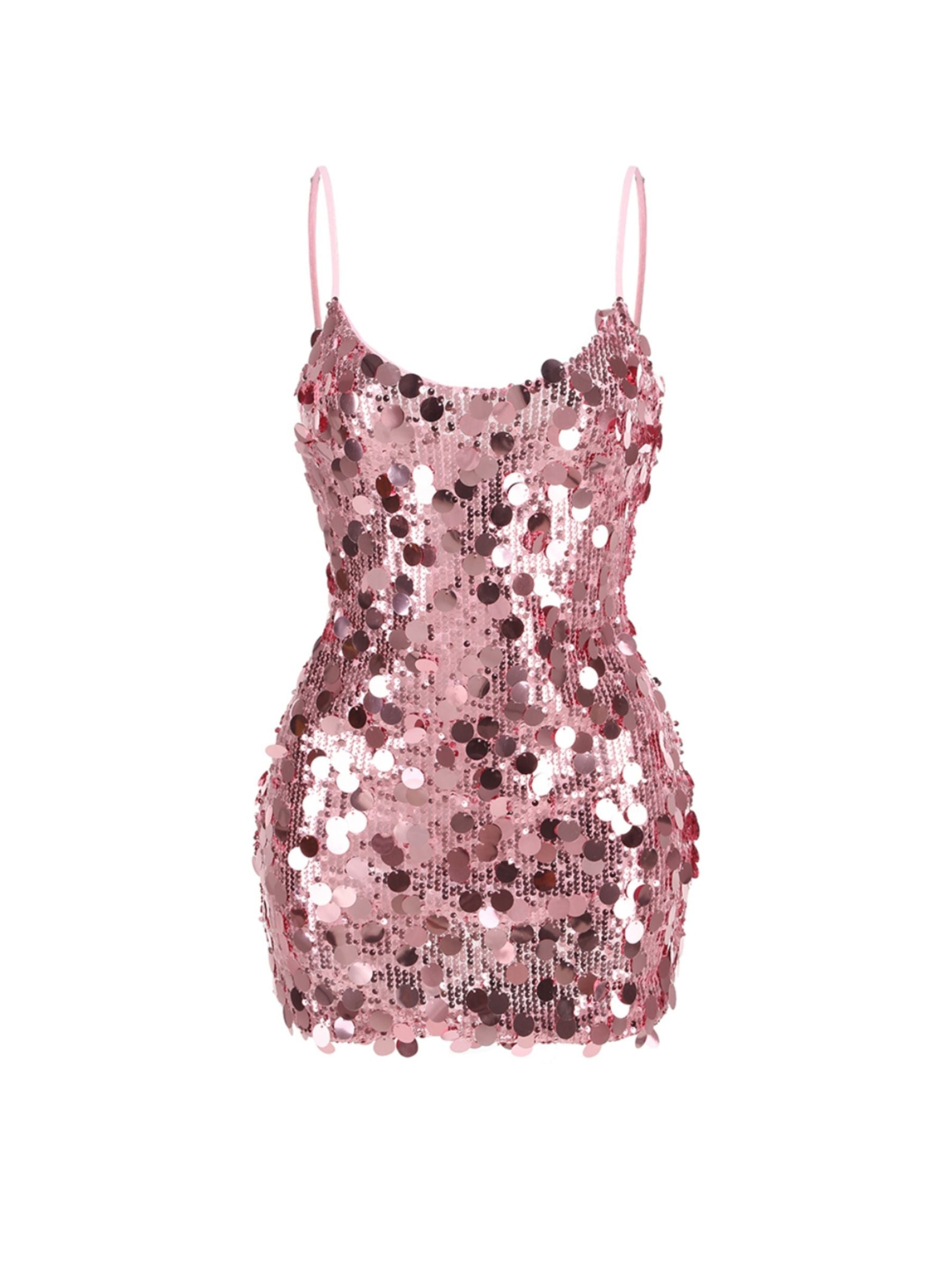 Shine bright with this pink sequin mini dress. featuring an all-over sequin design for a dazzling effect. The strappy shoulders and body-hugging fit enhance your silhouette. making it perfect for parties and special events. This glamorous piece adds a sparkling touch to your wardrobe essentials.