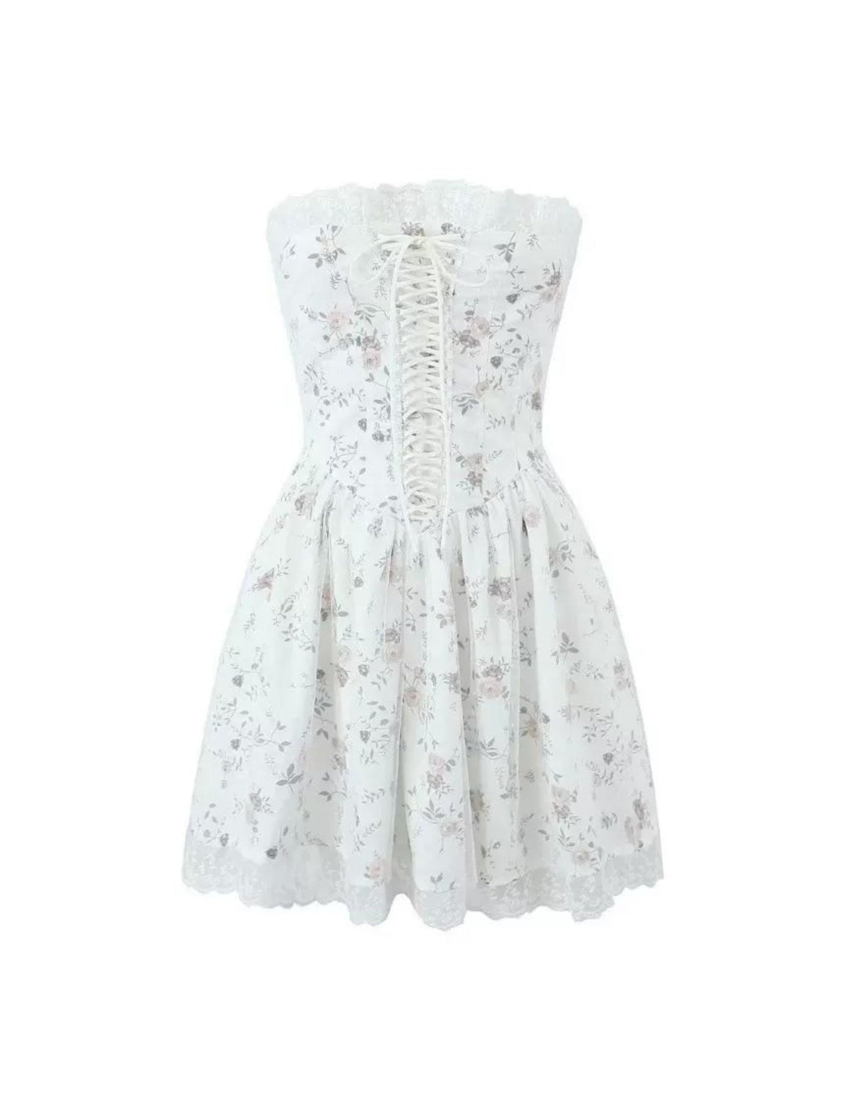 A romantic Penny Floral Mini Dress with a high waist and lace detailing. Strapless with a strappy cross design. this dress from the Izosu collection is available in both white and black. Perfect for a feminine and playful look.