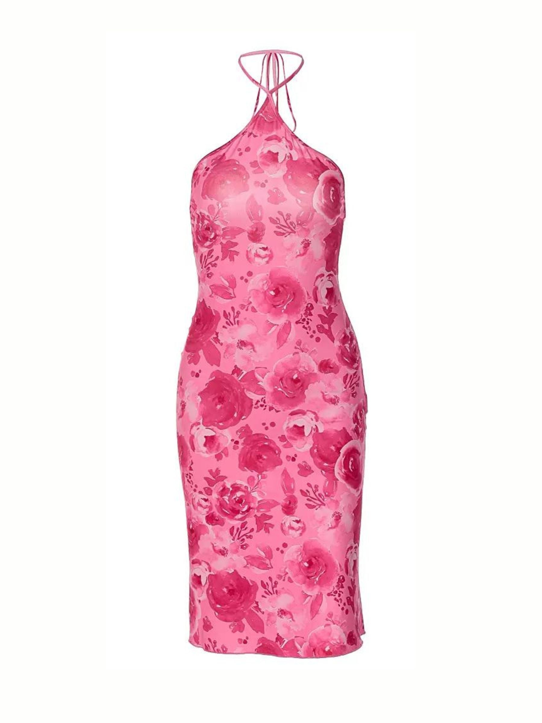 Add a touch of romance to your wardrobe with the Rhea Floral Midi Dress in Pink. The halterneck and sleeveless design create a slim. bodycon fit. while the backless detail adds a flirty touch. Perfect for the summer season. this dress is a must-have from Izosu Summer's in Bloom Collection.
