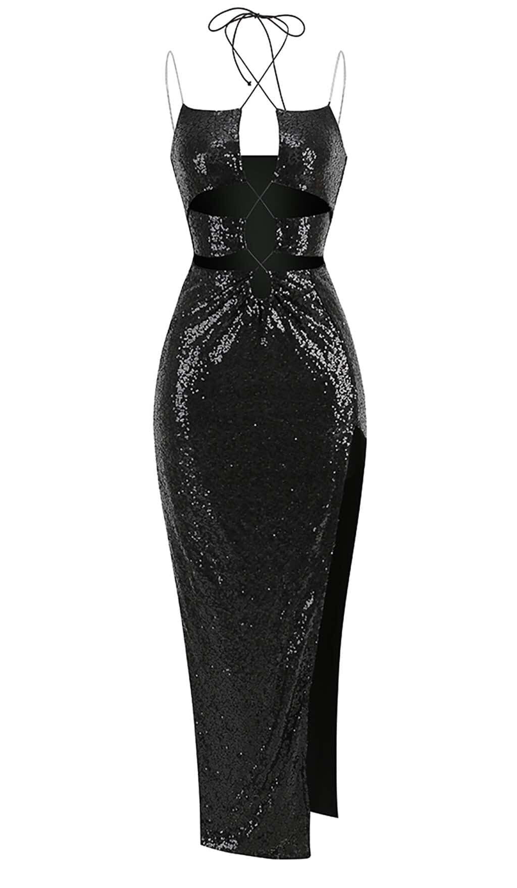Maxikleid mit Pailletten und Schlitz am Oberschenkel in Schwarz
