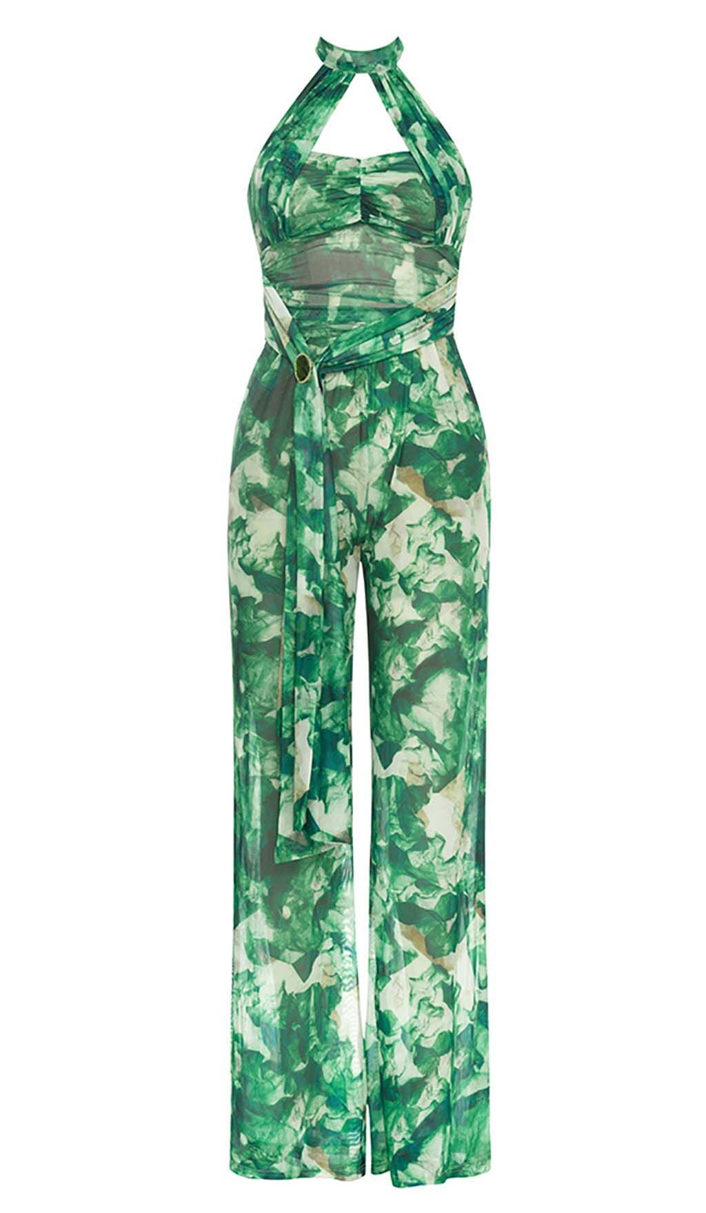TIE FRONT HALTER NECK BACKLESS JUMPSUIT IN GREEN