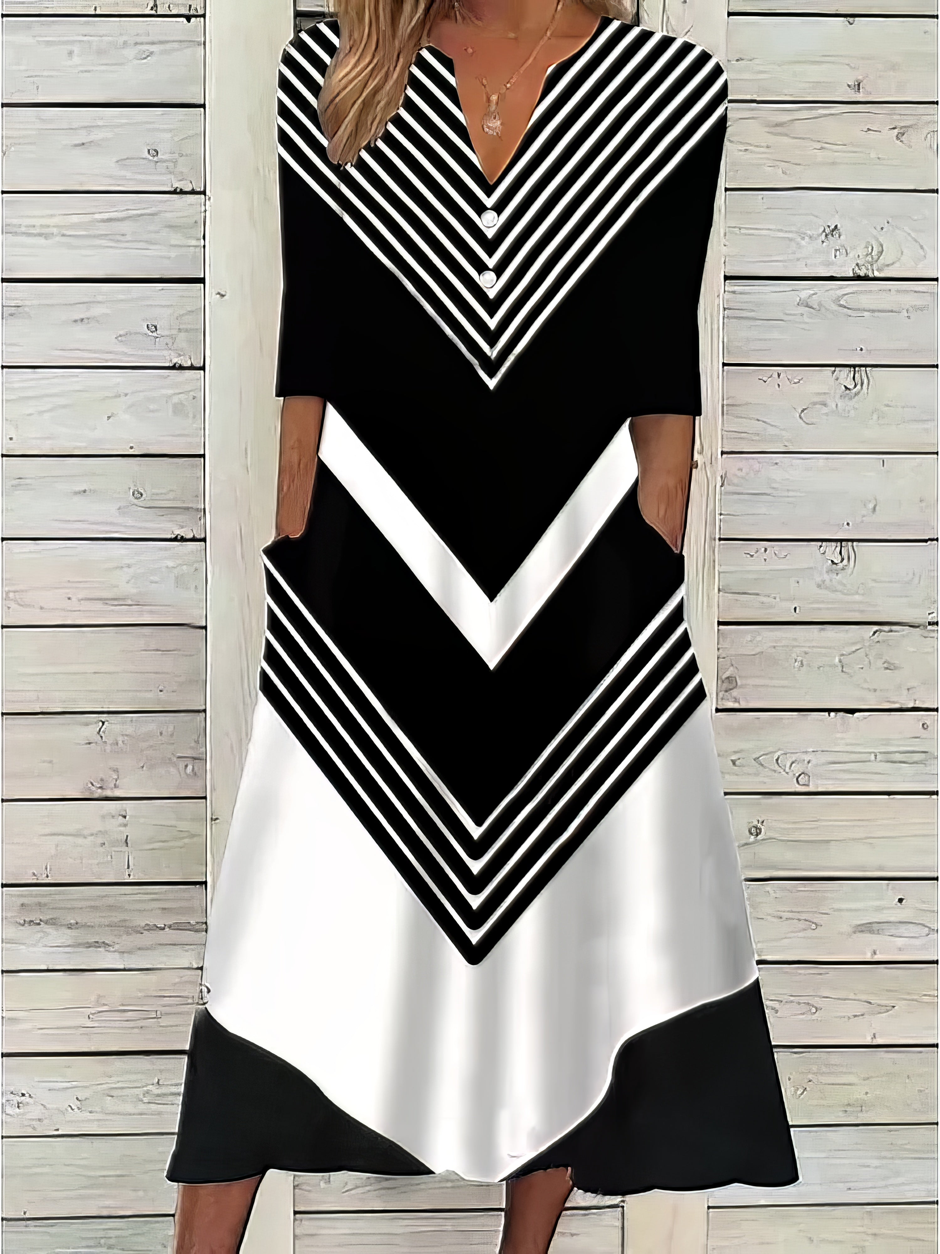 Dieser raffinierte Look wird garantiert alle Blicke auf sich ziehen. Das lässige Midikleid mit Streifen und halblangen Ärmeln, Farbblock-Knopfleiste und V-Ausschnitt besticht durch klassische Streifen, einen V-Ausschnitt und eine halblange Silhouette mit zusätzlichem Farbblock-Detail für einen modernen Touch. Kreieren Sie einen mühelos schicken Look mit diesem zeitlosen Midikleid.