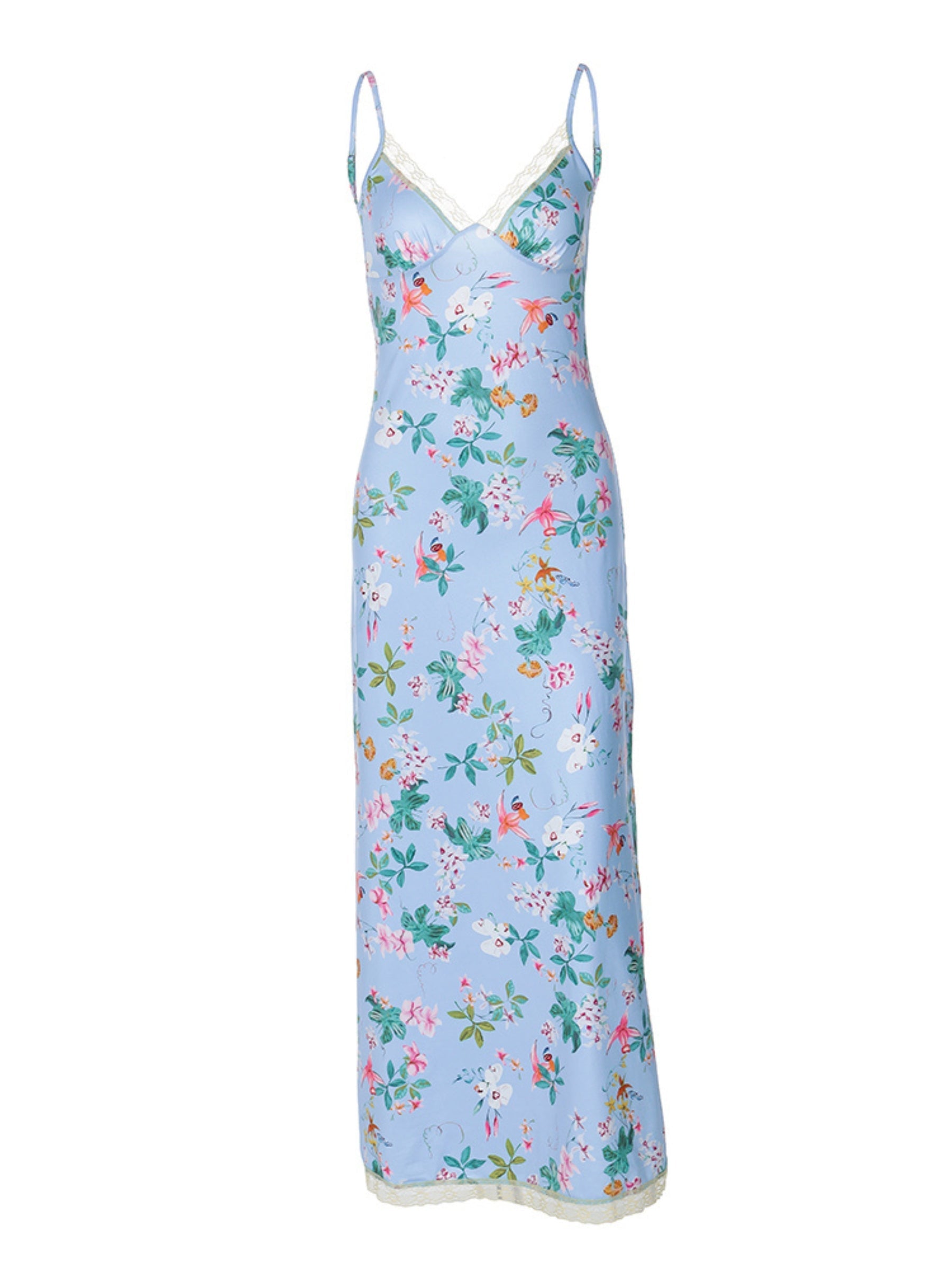 Embrace your feminine. romantic side with our Eleina Floral Maxi Dress in Blue. Featuring a delicate lace detailed V-neck. adjustable spaghetti straps. and a sexy backless design. this dress is perfect for the summer season. With a high waist and French-inspired style. it's part of our Izosu Summer in Bloom Collection. Enjoy looking effortlessly chic in this stunning dress.