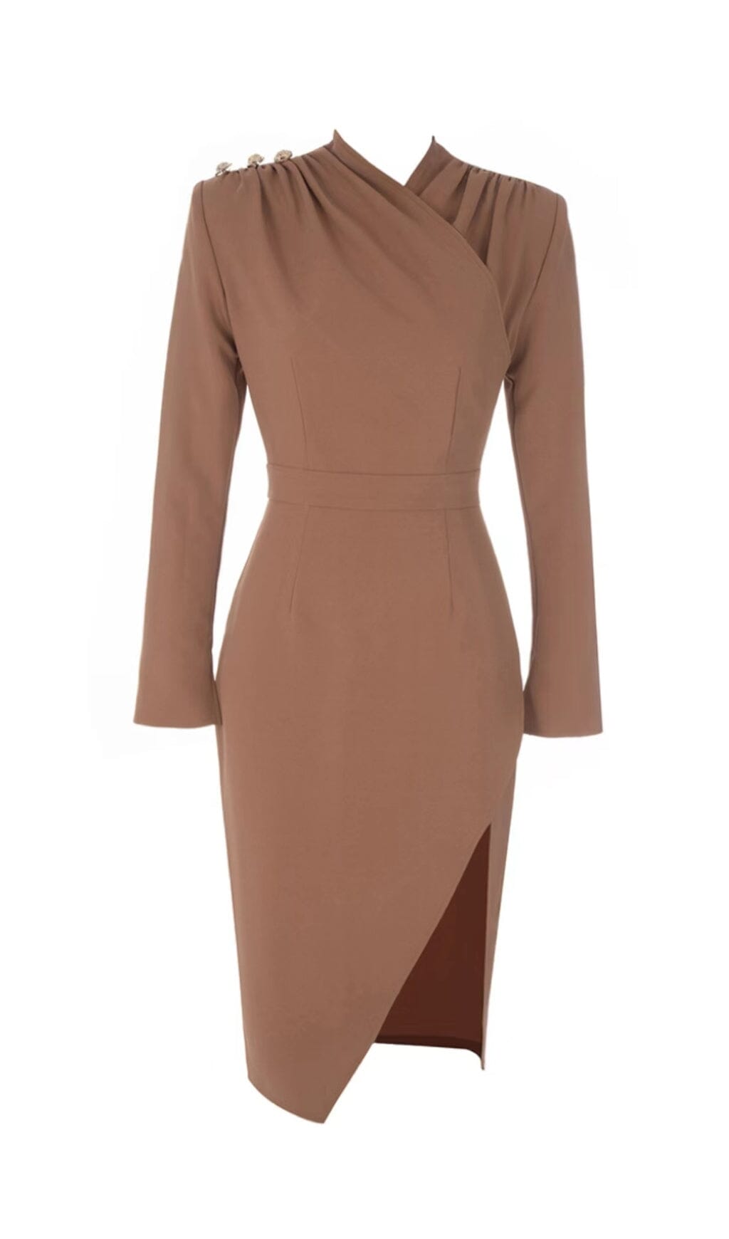 IRREGULAR PLEATED HIGH SPLIT METAL BUCKLE DRESS IN CAMEL