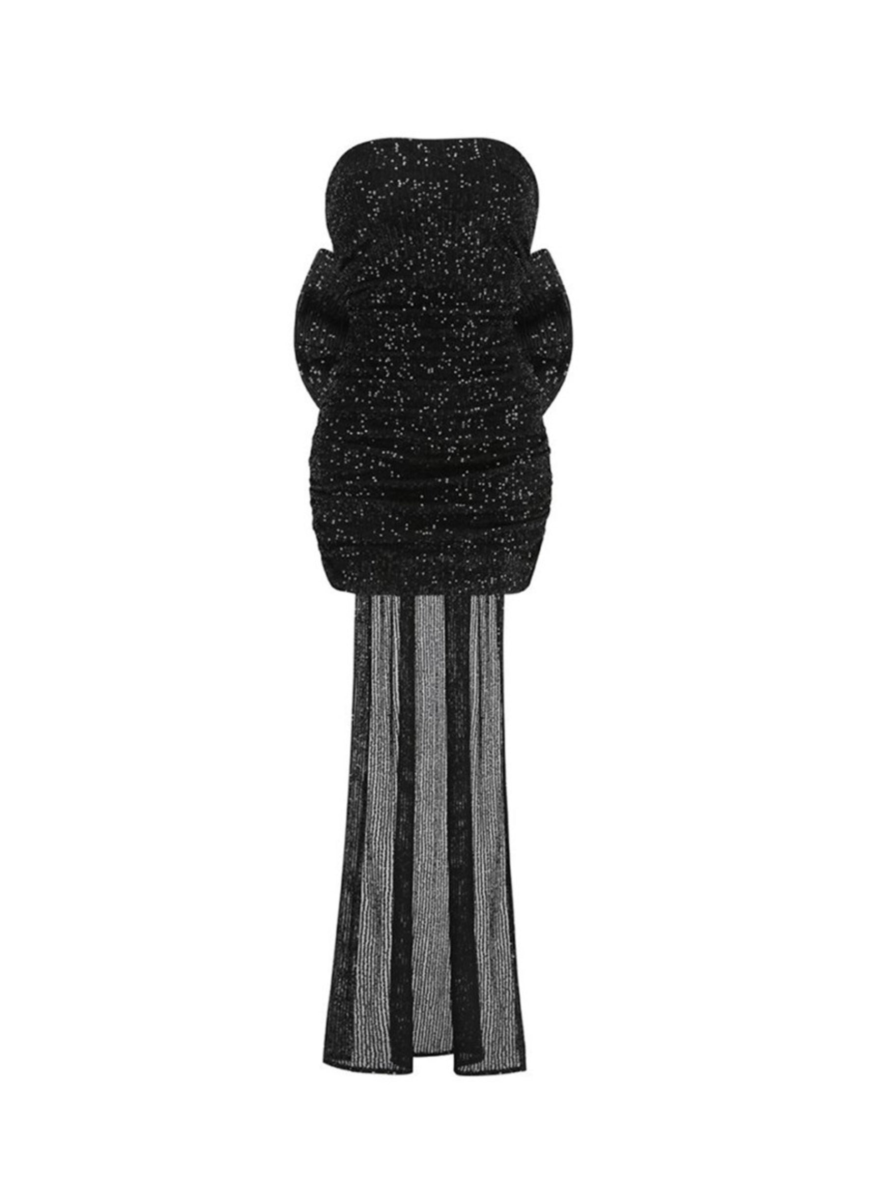 Shine bright in the Lesly Sequin Bow Dress in Gold. a show-stopping piece that combines playful charm with timeless elegance. This stunning strapless dress is crafted from figure-hugging elastic bandage fabric. ensuring a flattering fit that accentuates your curves.