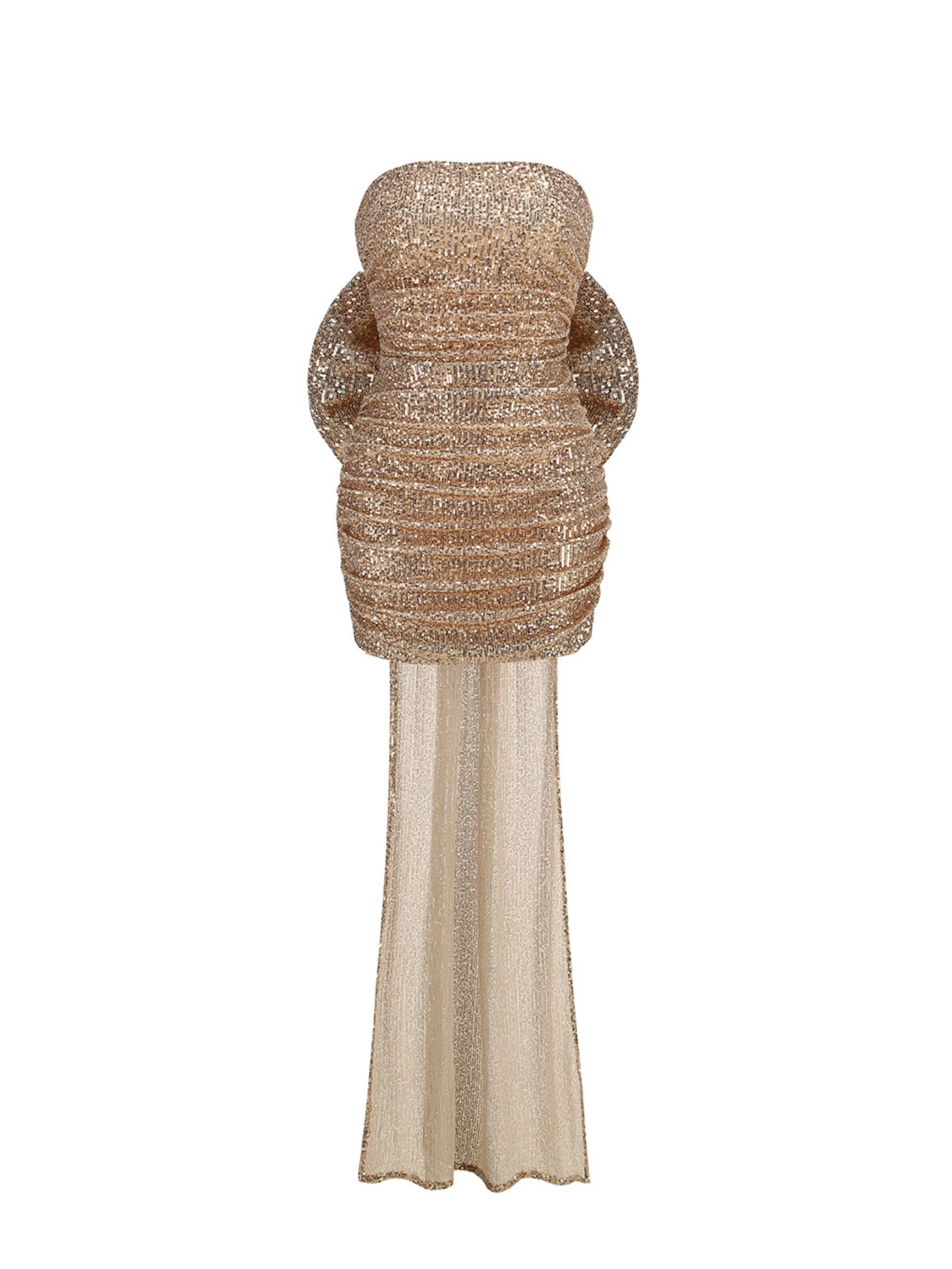 Shine bright in the Lesly Sequin Bow Dress in Gold. a show-stopping piece that combines playful charm with timeless elegance. This stunning strapless dress is crafted from figure-hugging elastic bandage fabric. ensuring a flattering fit that accentuates your curves.