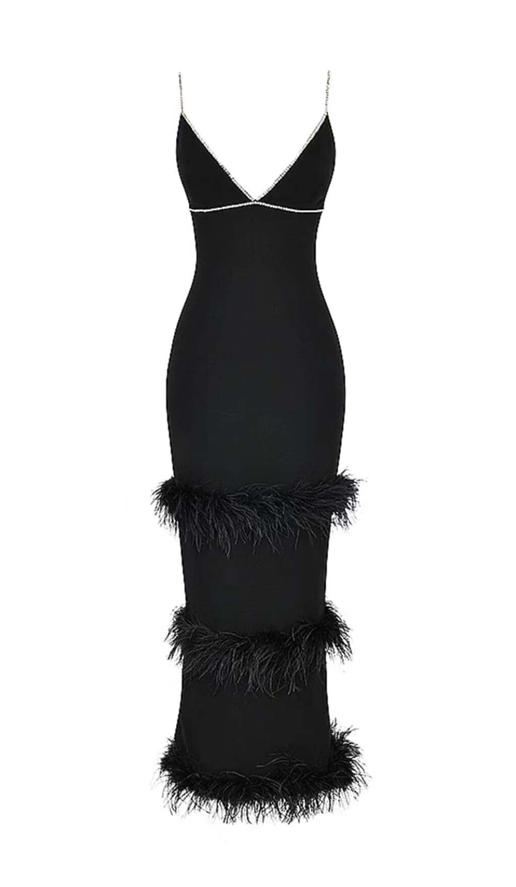 VESTIDO MIDI NEGRO CON PLUMAS Y ESCALONES DE DIAMANTES