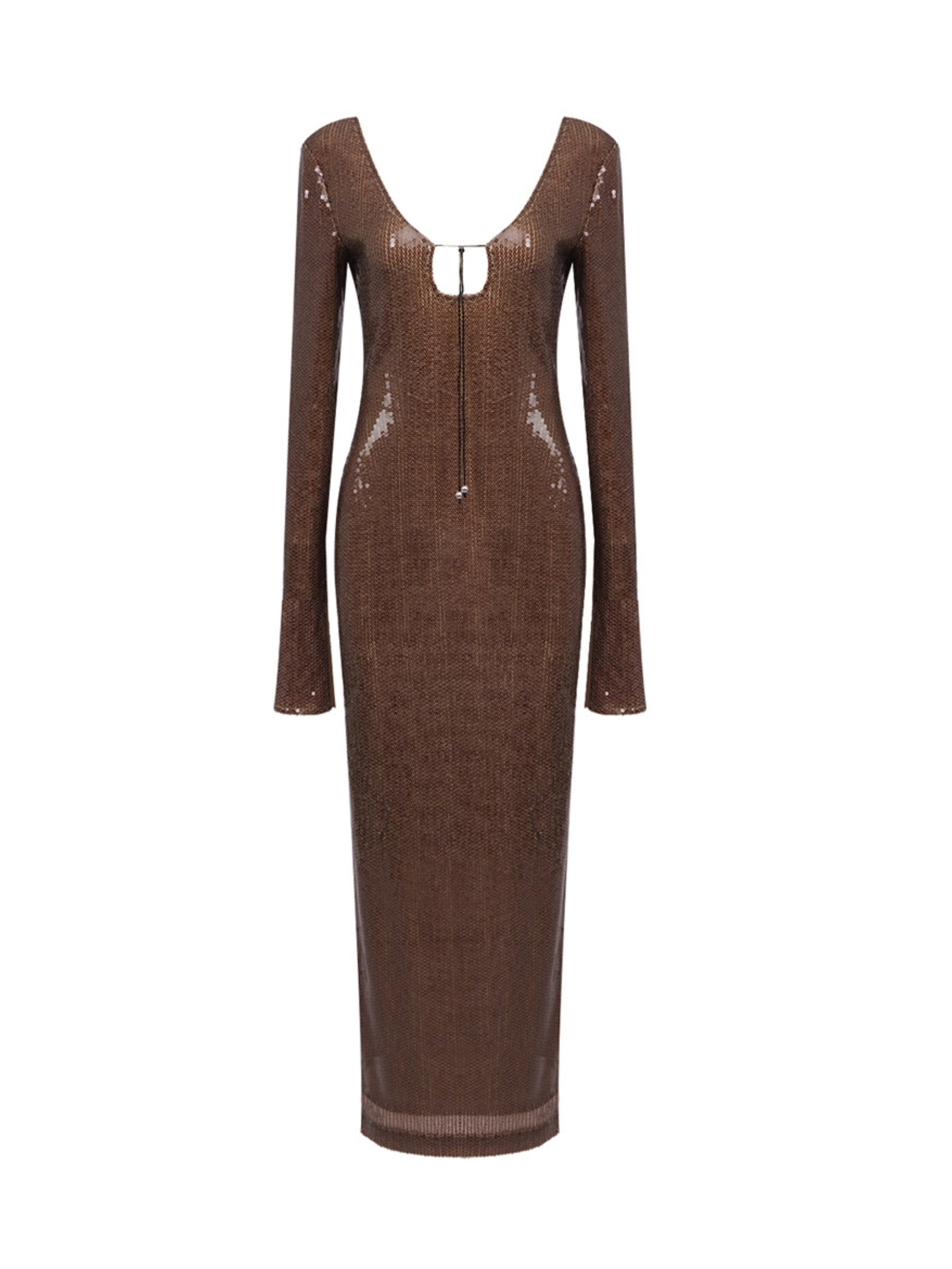 Unleash your inner glam with the Rowena dress. This long sleeve sequin stunner in brown is perfect for turning heads and showing some skin. The deep neckline adds a touch of elegance. while the slight see-through fabric adds a dash of sexiness. From the Izosu Evening Dresses Collection.