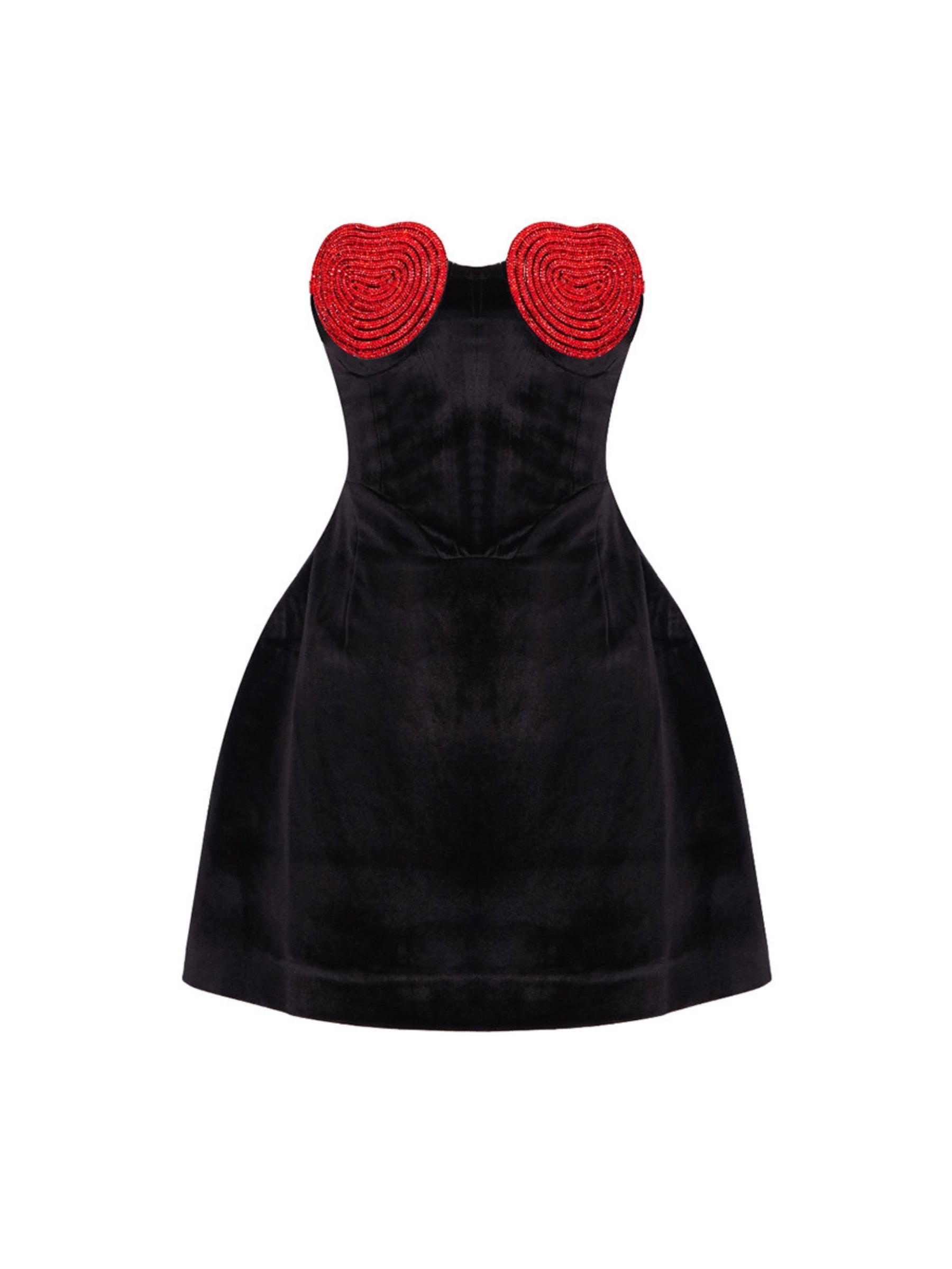 Step into romance with the Sayra Heart Embellished Mini Dress. This black velvet mini dress features two bold red heart-shaped embellishments on the bust. creating a stunning contrast. The structured silhouette hugs your figure. while the flared skirt adds playful movement. Designed for standout moments. this dress is perfect for Valentine's Day. date nights. or any occasion that calls for a touch of dramatic elegance.