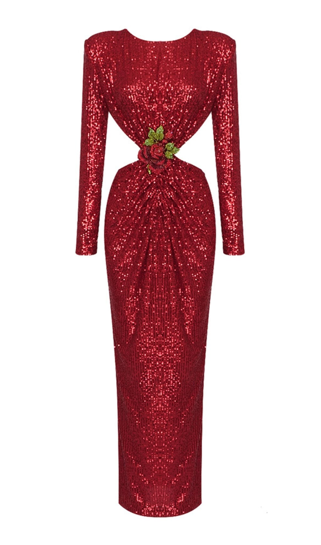 Fall for our RED Romance SEQUIN CUTOUT BACKLESS MAXI DRESS. we know you'll look radiant in this one. This dress features flowers at the waist for a playful yet sexy look. The side cutouts and open back let you see and make you look more attractive. Crafted from rayon. our dresses look best with strappy pumps and a chic clutch. Created to enhance your frame and sparkle all night long. we can definitely see this statement maxi dress in your future.