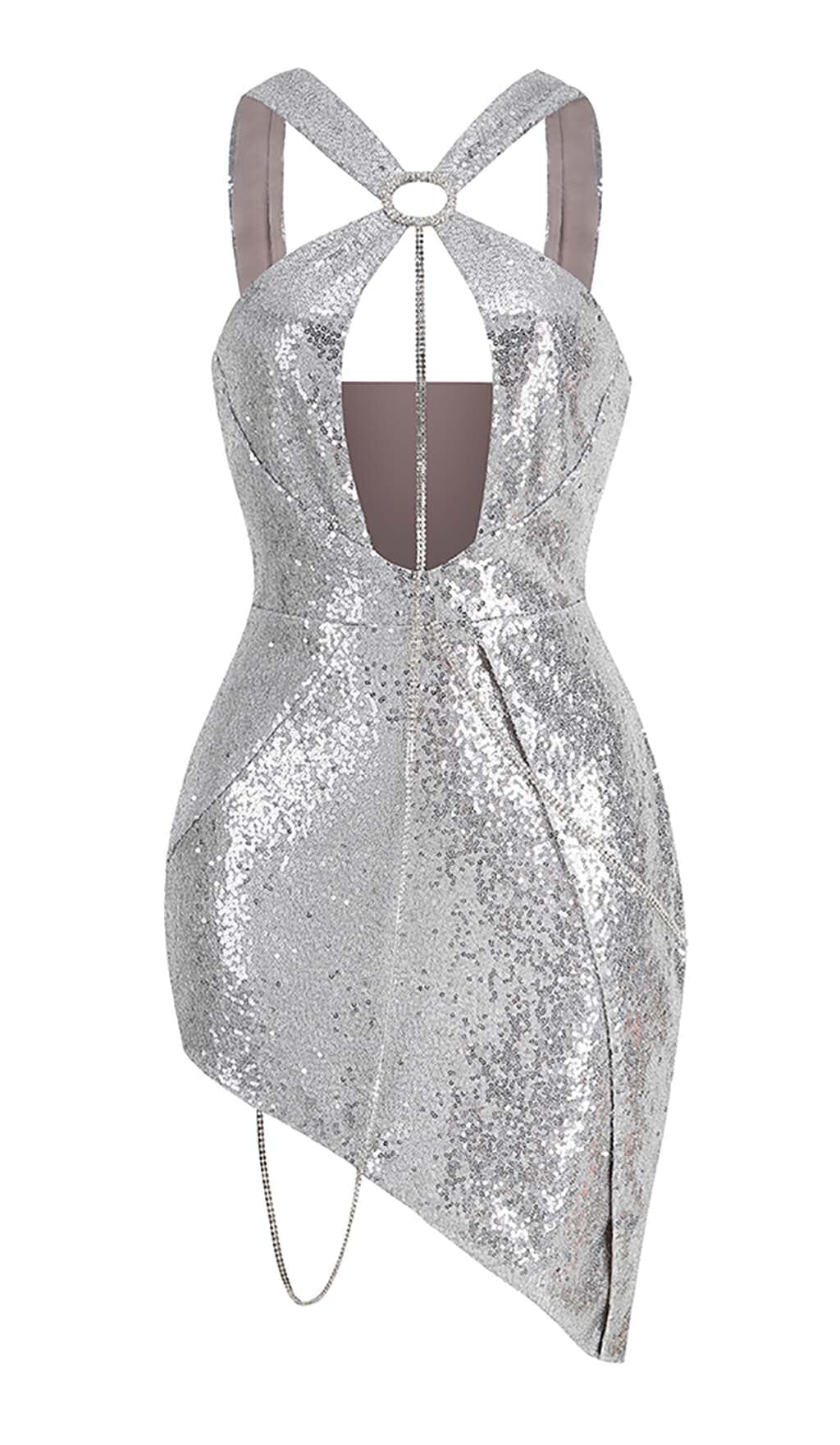 Luce una entrada glamurosa con este fascinante vestido asimétrico con lentejuelas y aberturas en plata brillante. Presenta un corpiño ceñido con un elegante detalle de espalda cruzada y una falda asimétrica y vaporosa. Este deslumbrante vestido causa un gran impacto. Combínalo con tacones de tiras para tu próximo cóctel o gala.