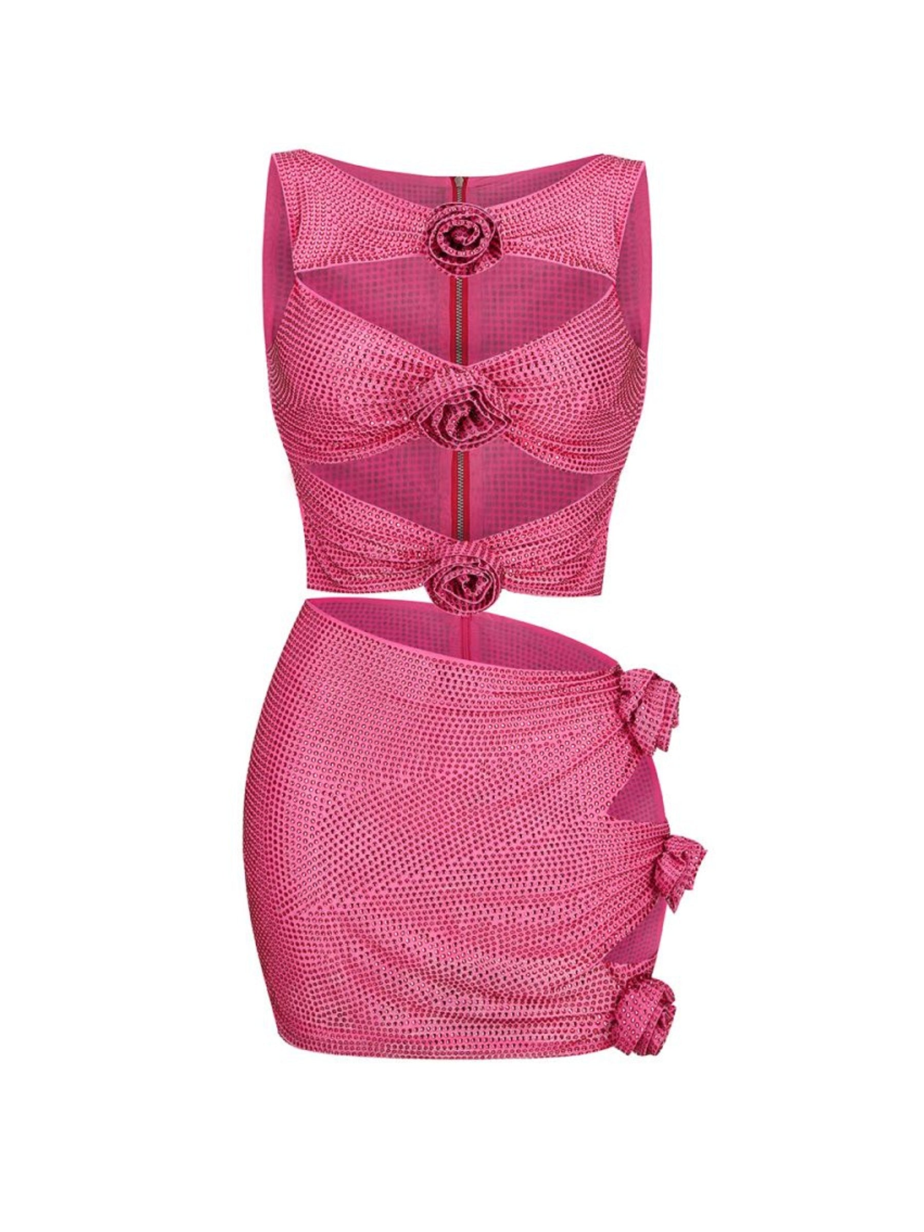 The Vanesa Embroidery Skirt Set in Hot Pink is a two piece outfit that is both sexy and stylish. The sleeveless top features a unique hollow cut design and crystal embroidery. while the elastic waist mini skirt provides both comfort and a flattering fit. Perfect for any occasion. this set is part of the Izosu Evening Dresses Collection.