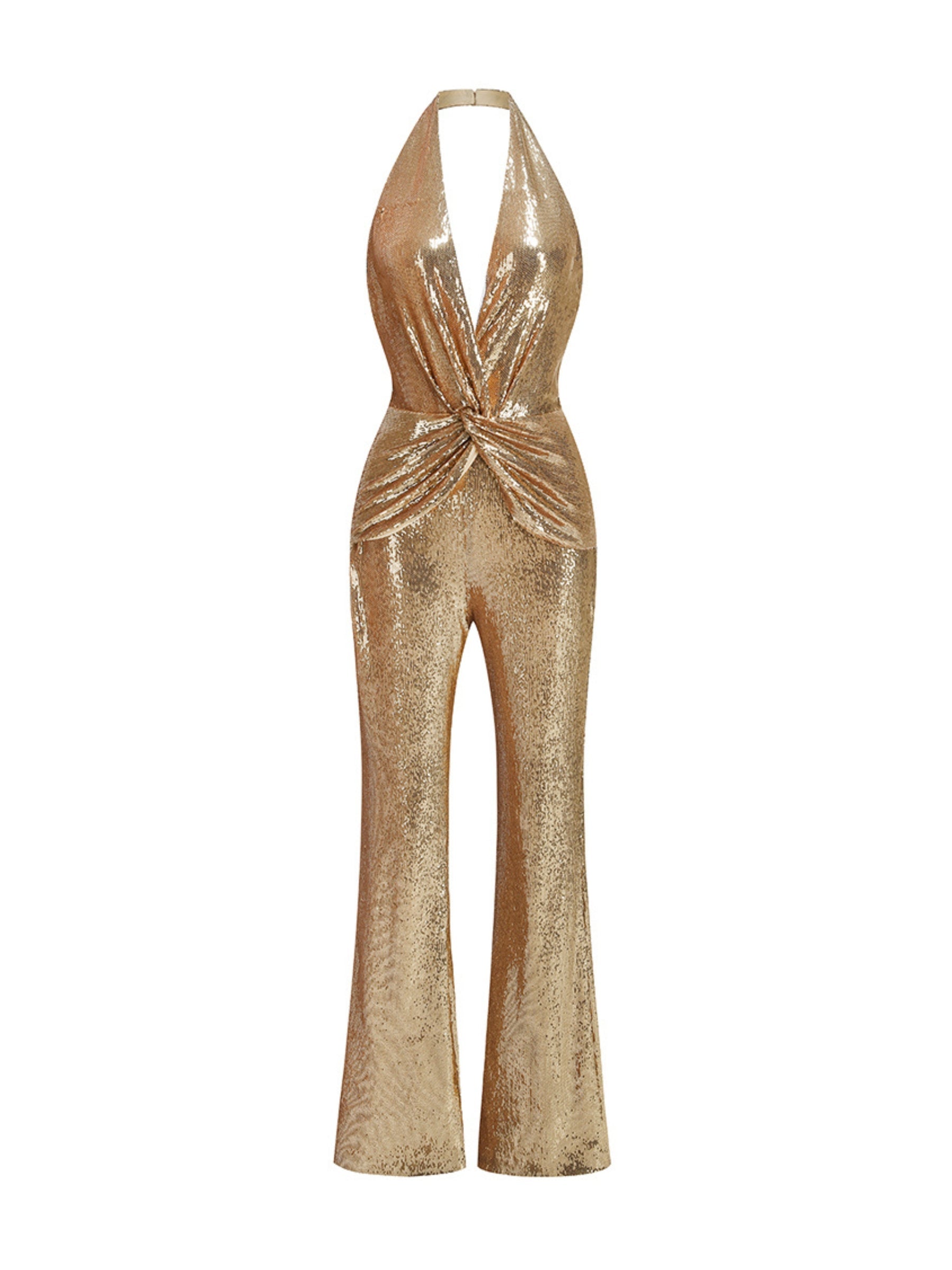 Get ready to shine in the Anwen Sequin Jumpsuit! This stunning gold jumpsuit is the perfect combination of sexy and elegant with its sleeveless. halterneck. and high neck design. The backless feature adds a touch of allure. From the Izosu Party & Cocktail Collection.