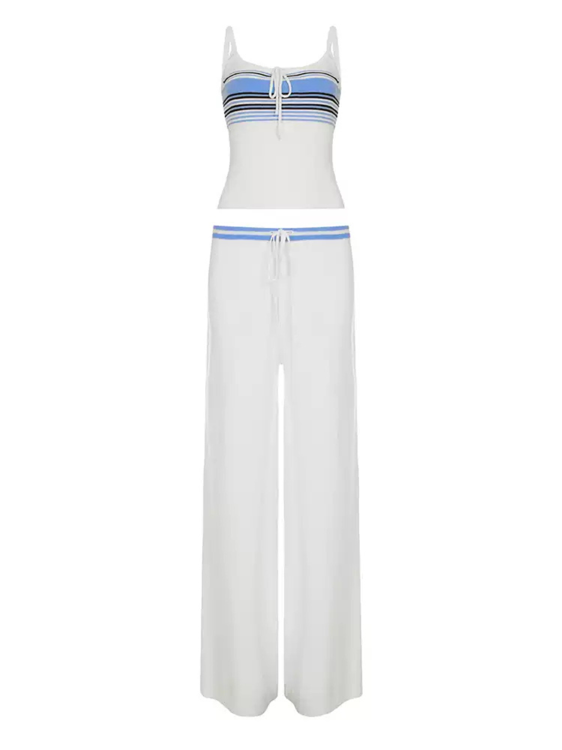 Unleash your sporty side with the Aubrey Knit Two-Piece Set! This set features a cropped tank and wide-leg pants made from soft ribbed knit fabric for ultimate comfort. The adjustable drawstring detail at the bust and elastic waistband with drawstring create a customizable and flattering fit. With subtle blue and white striped details. this set is perfect for casual outings or lounging in style. Part of the Izosu Sets Collection.