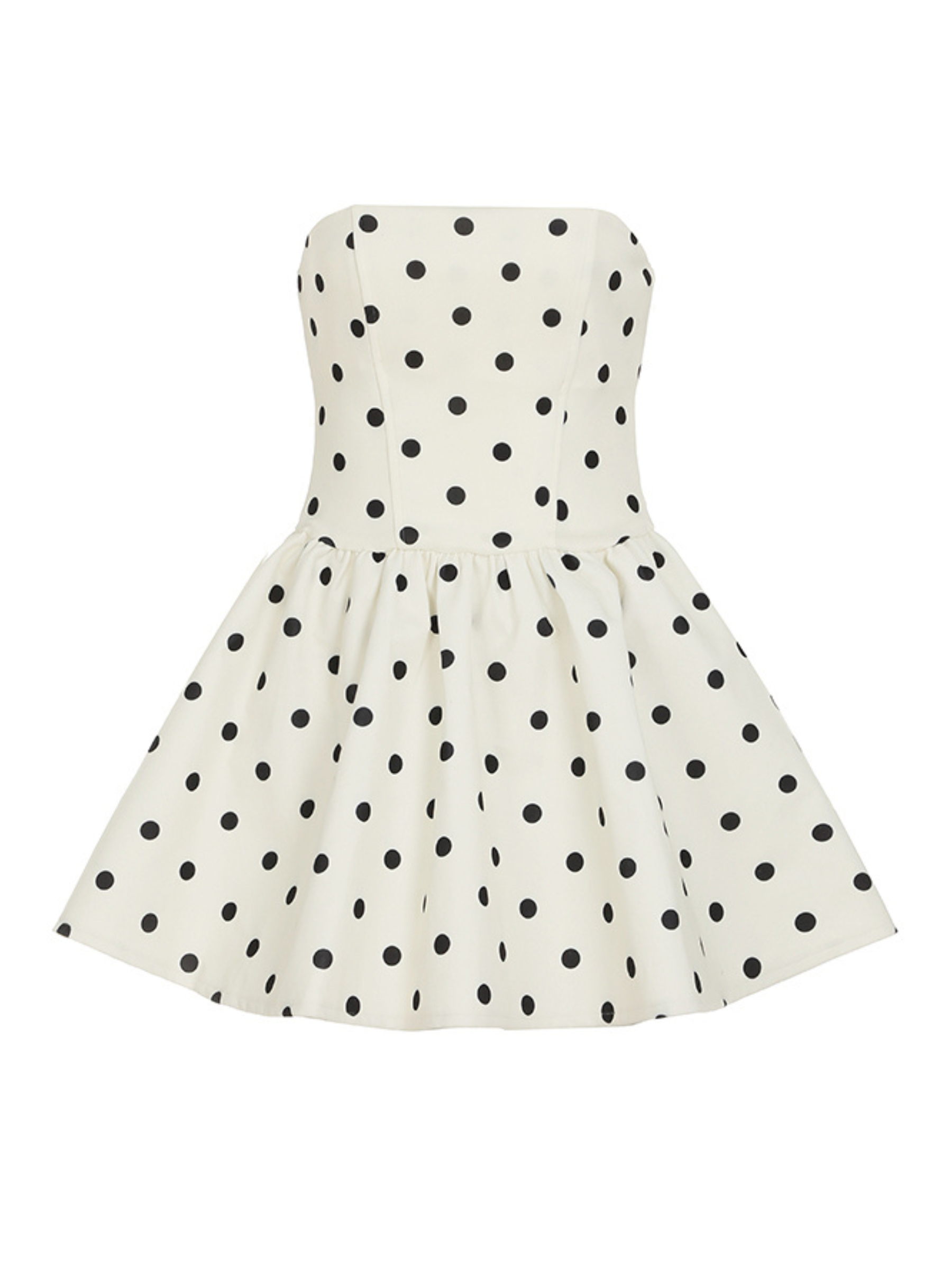 Channel playful elegance with the Elodie Polka Dot Strapless Mini Dress. Featuring a charming black polka dot print over a creamy white base. this flirty silhouette is designed to highlight the waist with its structured corset-style bodice and voluminous mini skirt. The strapless neckline enhances your shoulders and décolletage. while the subtle back zipper and contrasting black bow at the waist add a touch of retro flair. Whether you're attending a summer soirée or a romantic rooftop dinner. this dress promises to turn heads.