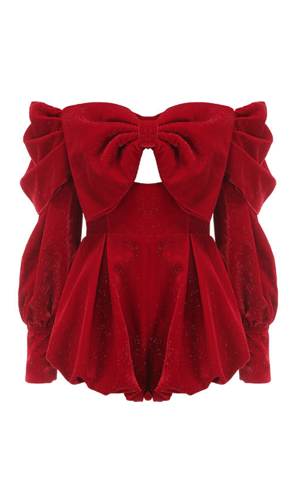 This is a jumpsuit with bloomers. But it is more like a mini dress. and more lovely in charming. With statement puff shoulders and long textured sleeves. we're so ready for festive nights out in this one. You're the gift here. honey.