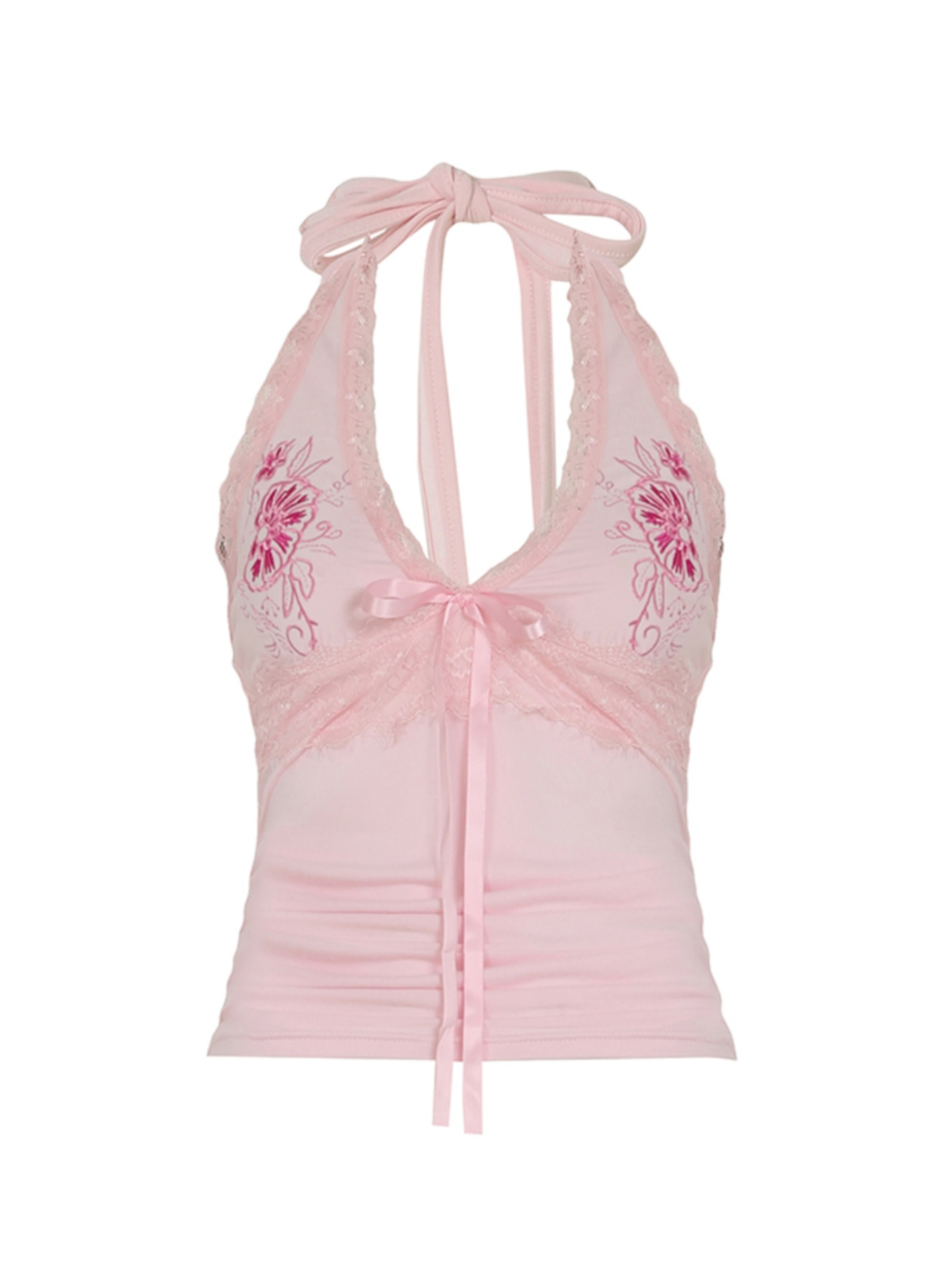 The Ginny Lace Detail Halter Top is the perfect blend of delicate romance and sultry allure. Featuring soft pink sheer mesh with intricate floral embroidery. this halter-style top is designed to accentuate your curves while keeping things playful and feminine. The adjustable tie at the neck and front bow detailing add a charming touch. while the ruched design ensures a flattering fit. Whether paired with jeans for a chic night-out look or styled with a matching lingerie set for intimate moments. this top is a statement piece that embodies elegance and sensuality.