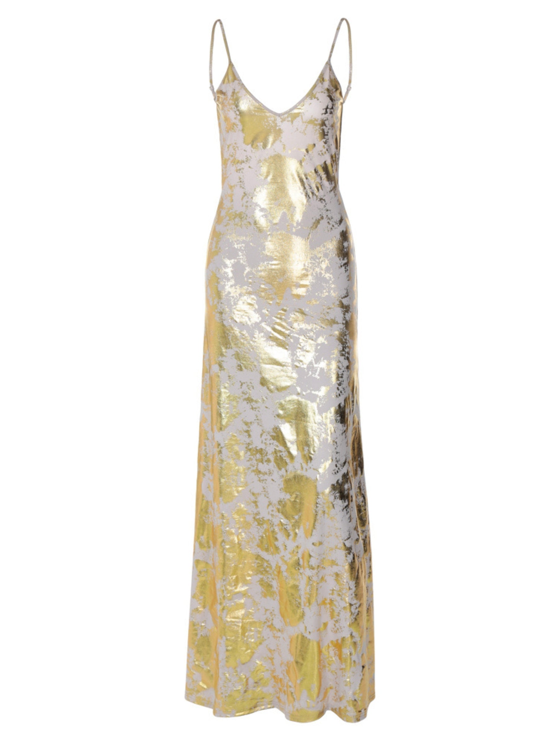 The Haily Backless Maxi Dress in Gold is a stunning addition to the Izosu Spring-Summer Collection. Its sleeveless design. deep V-neck. and adjustable spaghetti straps create a slim fit that hugs your curves in all the right places. Made with metallic fabric. this dress exudes a sexy and playful vibe.