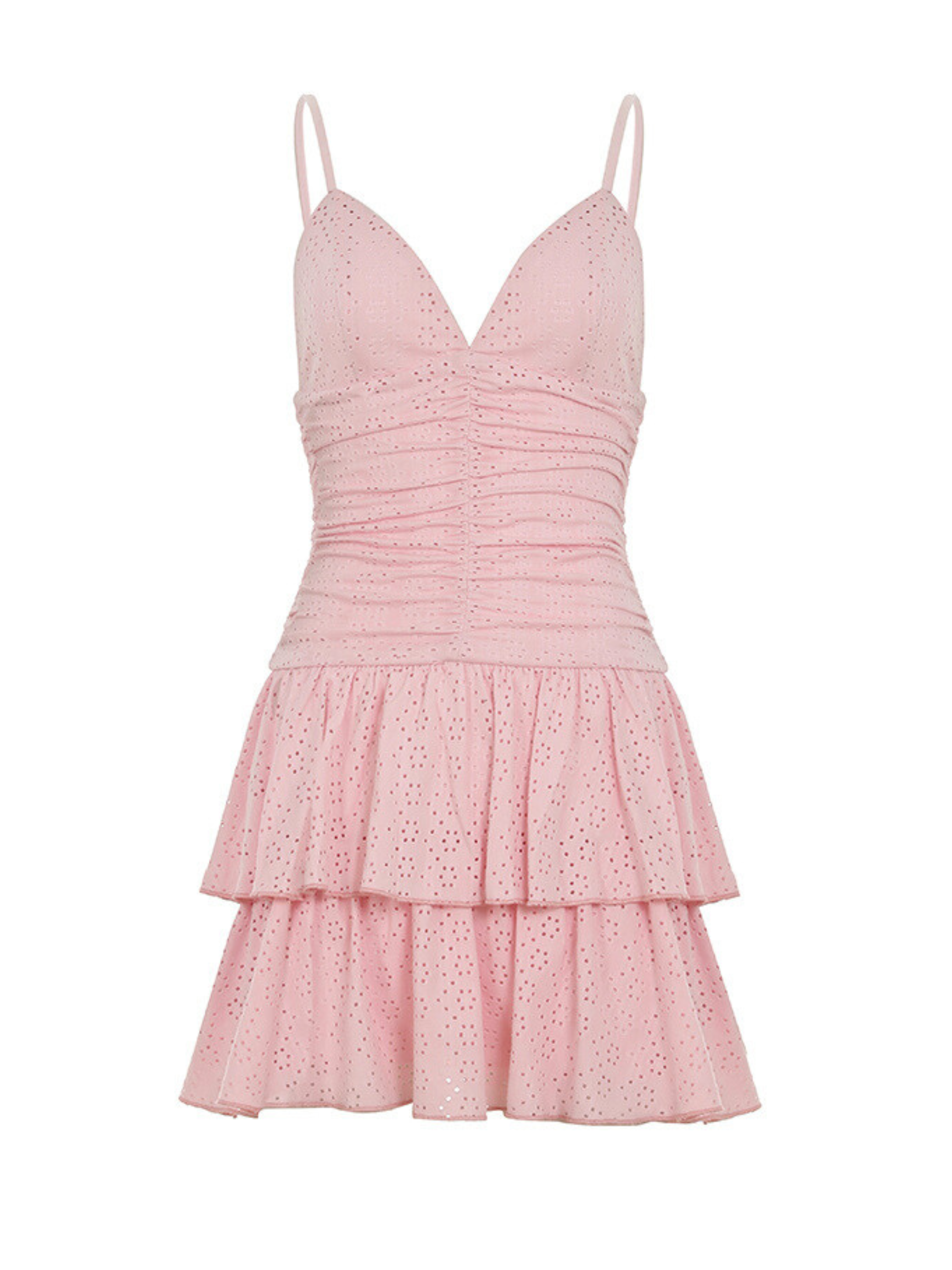 Turn heads in the Miarose Eyelet Ruffle Mini Dress. a flirty and feminine piece that combines delicate texture with a playful silhouette. Made in a soft pink hue. this dress features a ruched bodice with a deep V neckline and adjustable spaghetti straps for a flattering fit. The tiered ruffle hem adds volume and movement. making it perfect for brunch dates. rooftop evenings. or summertime strolls.