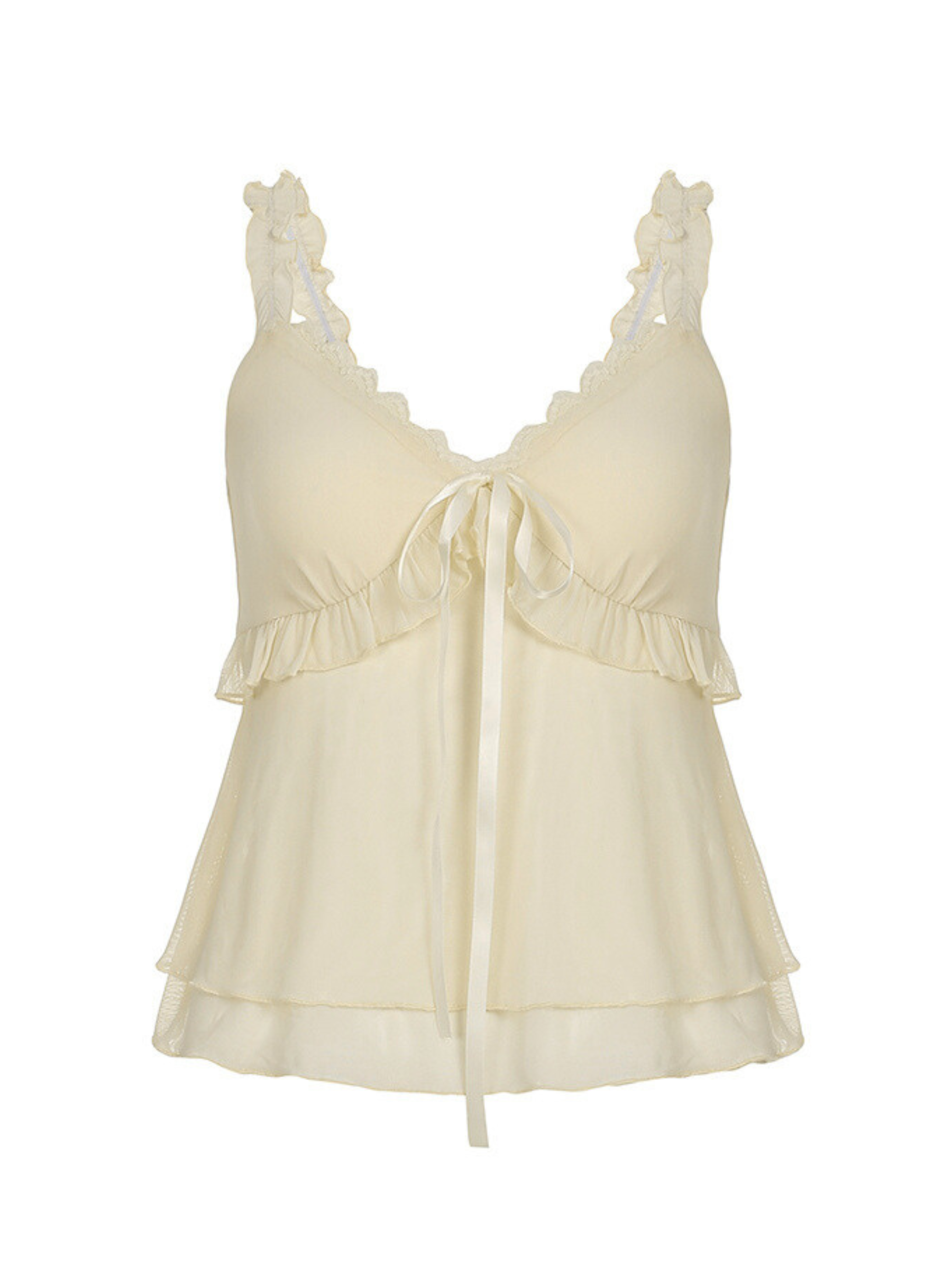 • V-neckline with dainty lace trim and ruffle straps