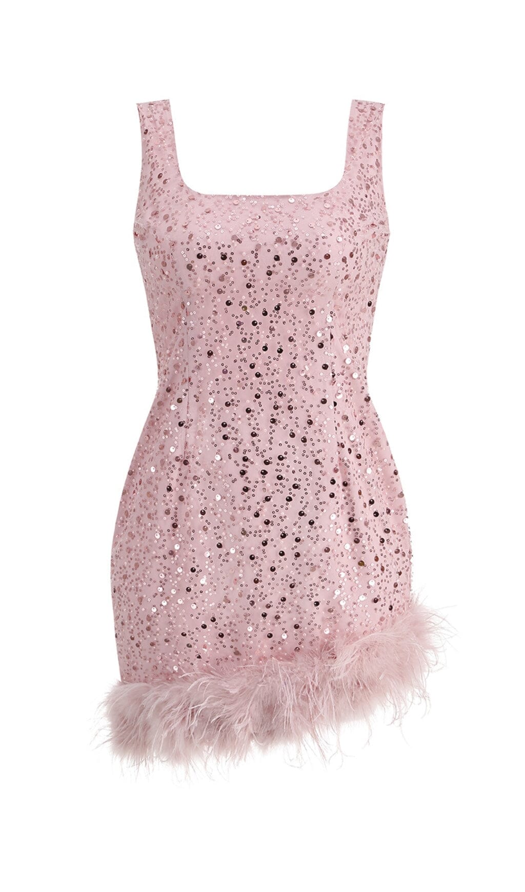 Make a bold and unforgettable statement in this stunning Pink Feather Sequin Dress. This dress is the perfect combination of classic elegance and modern edge. featuring a fitted silhouette that hugs your curves and a red sequin design that catches the light from every angle. The feather trim adds a touch of drama and movement. making this dress a true showstopper.