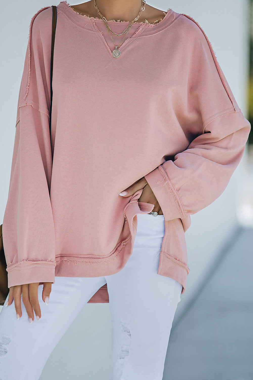 Pink Frayed Trim Side Slit Loose Sweatshirt