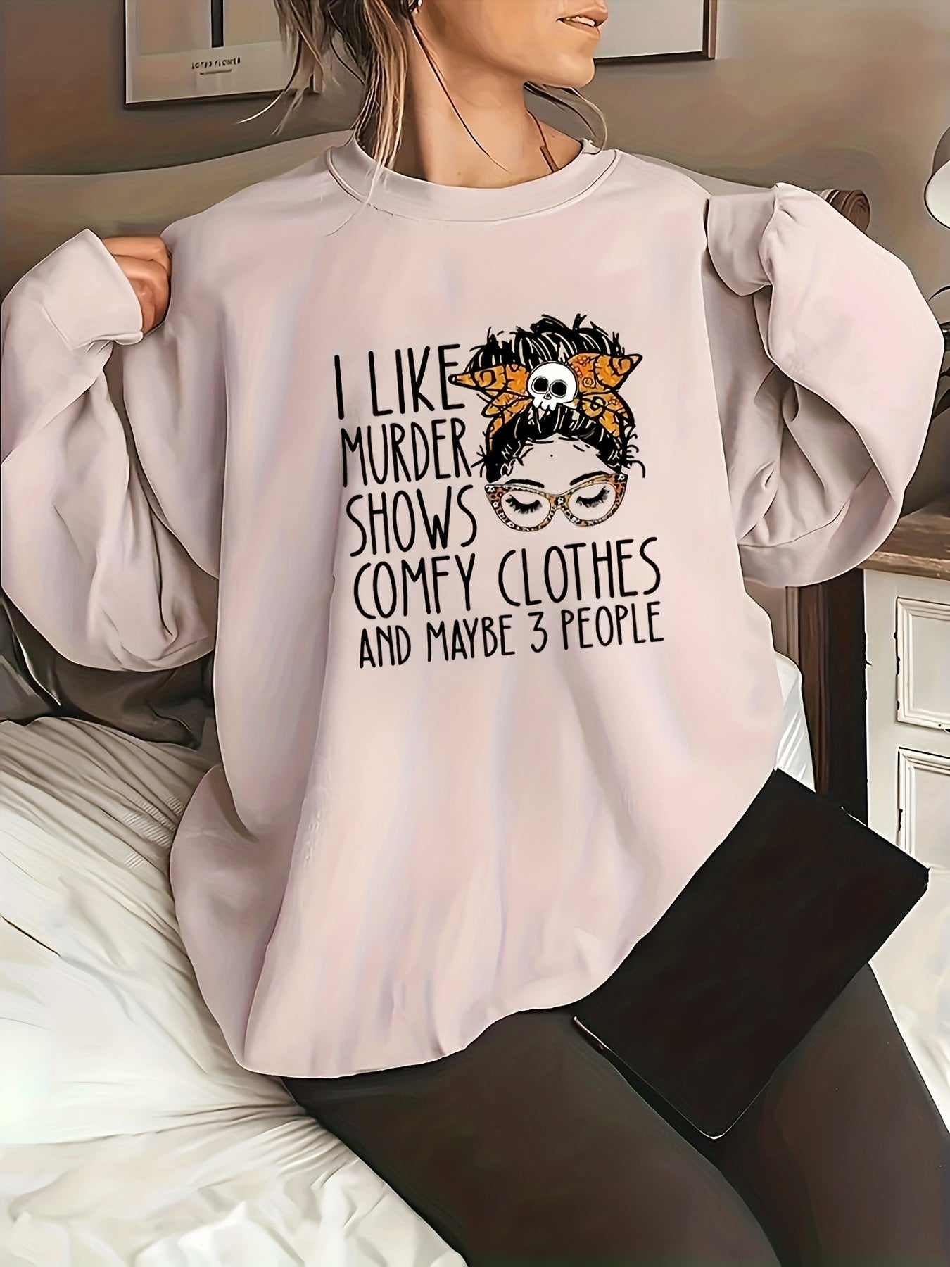 Plus Size Casual Sweatshirt, Women's Plus Cartoon Figure & Slogan Print Long Sleeve Crew Neck Slight Stretch Pullover Sweatshirt, Casual Tops For Fall & Winter, Plus Size Women's Clothing