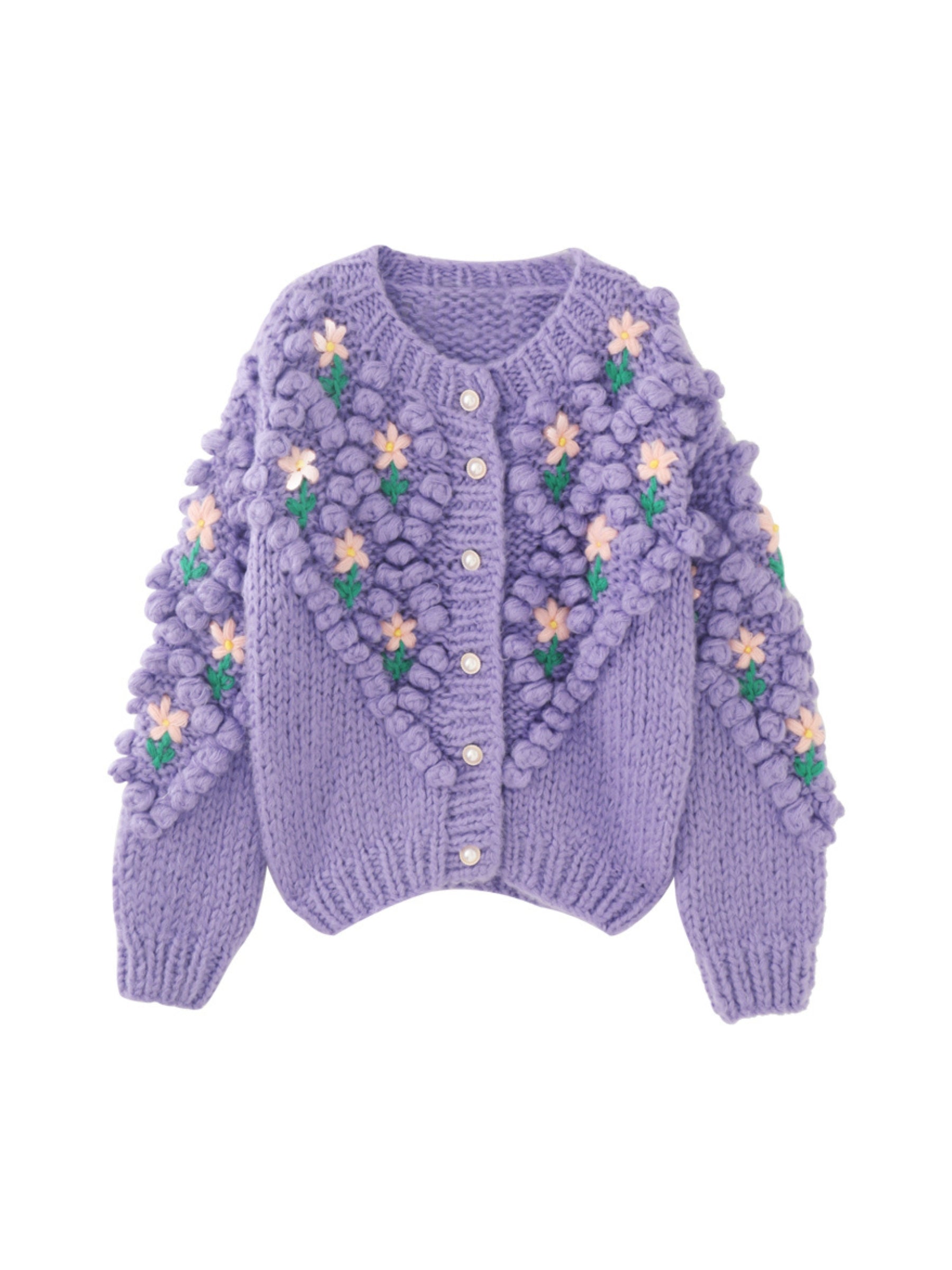 Add a splash of floral charm to your wardrobe with the Rania Floral Knitted Cardigan in Purple. This eye-catching lavender cardigan features intricate hand-knitted flower details. with delicate yellow blooms and green stems. creating a whimsical yet cozy aesthetic. Perfect for layering in cooler weather. this cardigan combines craftsmanship with style.