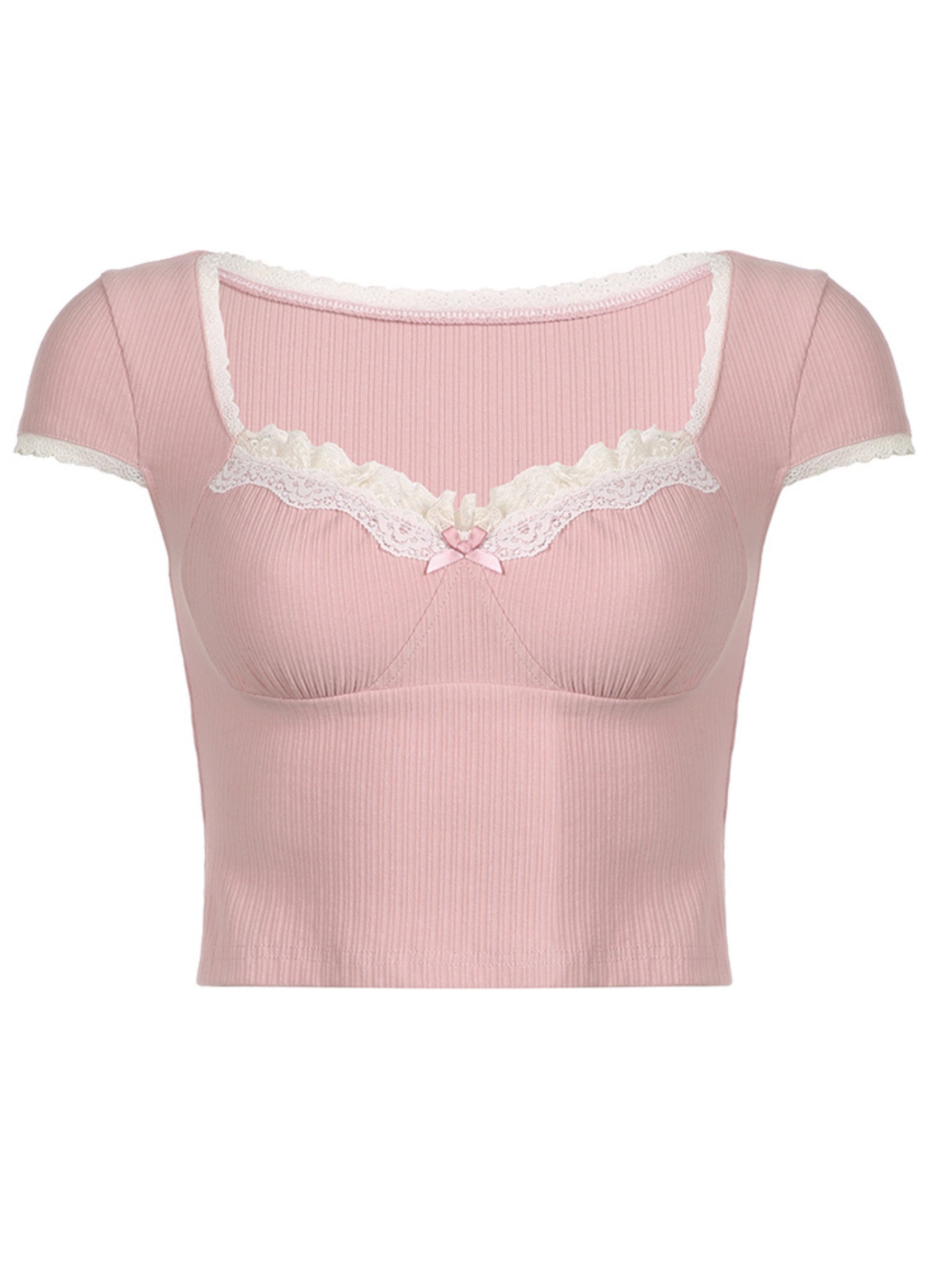 Get ready to feel feminine and romantic in our Rubie Short Sleeve Crop Top. part of our Izosu collection. With delicate lace detailing and mini floral accents. this top offers a slim fit and French-inspired style. Perfect for those "good girl" vibes.