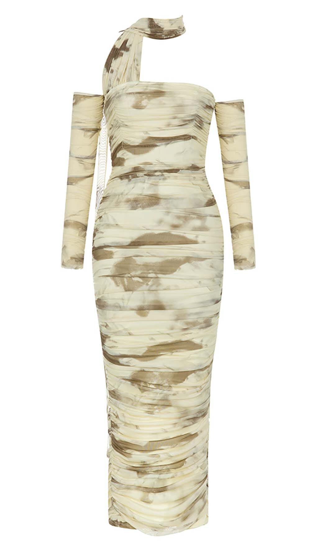 RUCHED BANDEAU MIDI DRESS IN BEIGE