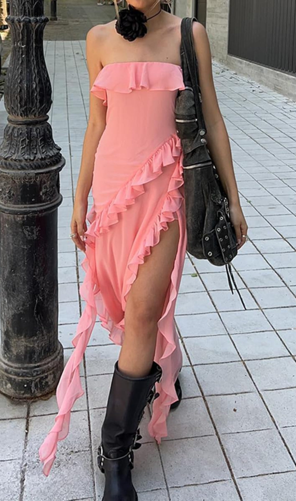 STRAPLESS RUFFLE MAXI DRESS IN PINK