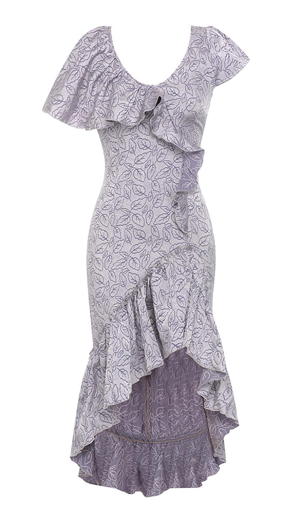 RUFFLED V-NECK ASYMMETRIC MIDI DRESS IN PURPLE