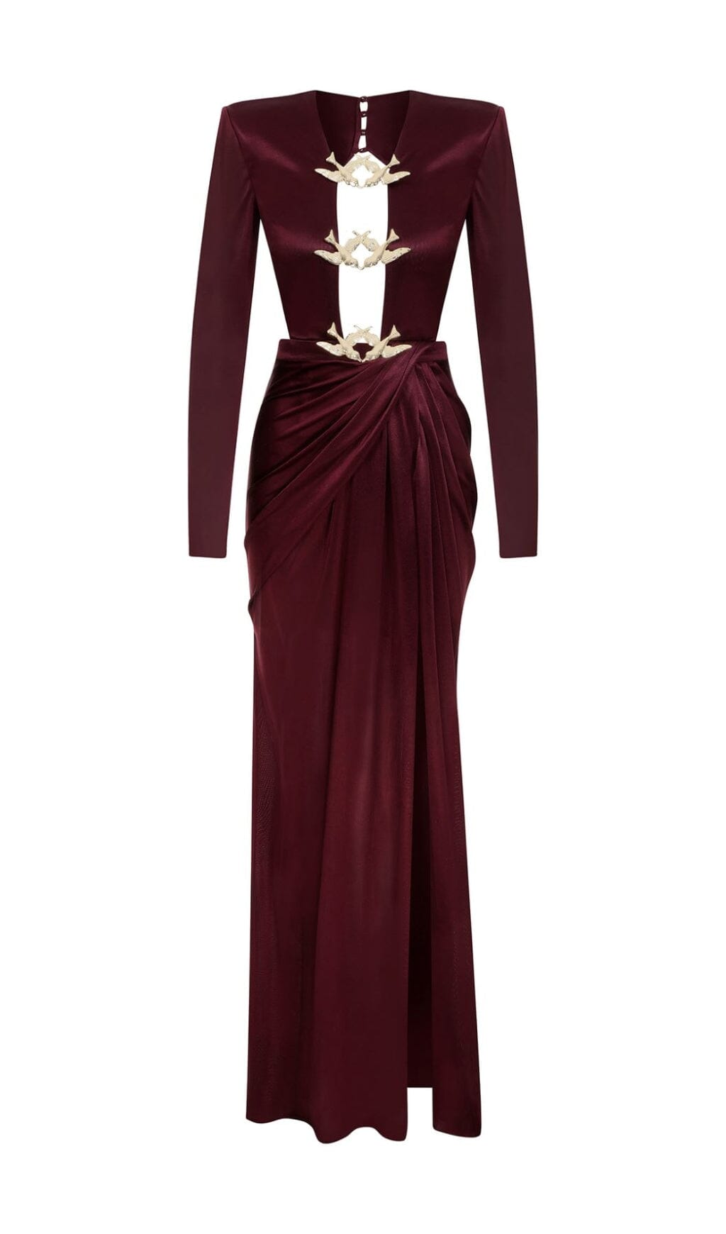 SATIN HOLLOW OUT LONG SLEEVE MAXI DRESS IN RED