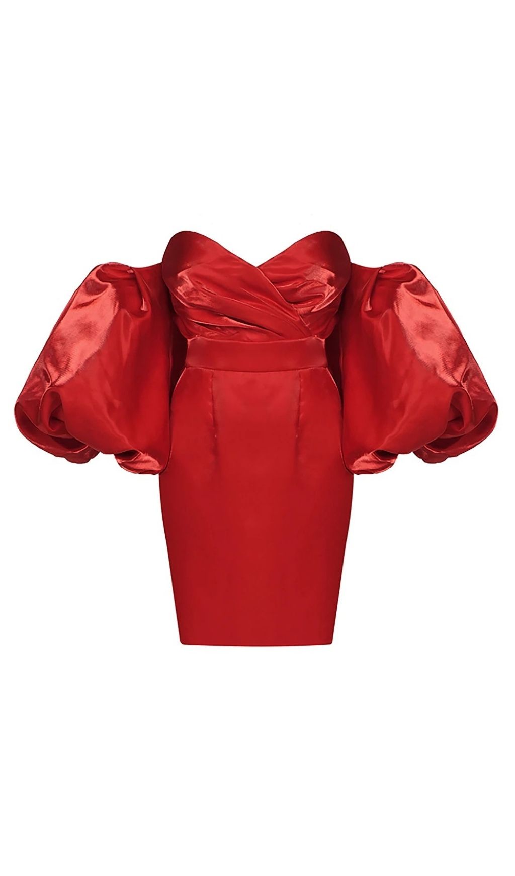 SATIN PUFF SLEEVE MINI DRESS IN RED