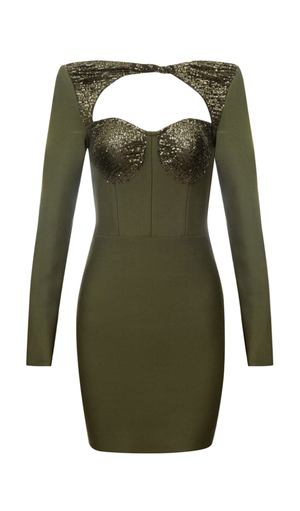 SEQUIN BODICE HIP WRAP DRESS IN OLIVE GREEN
