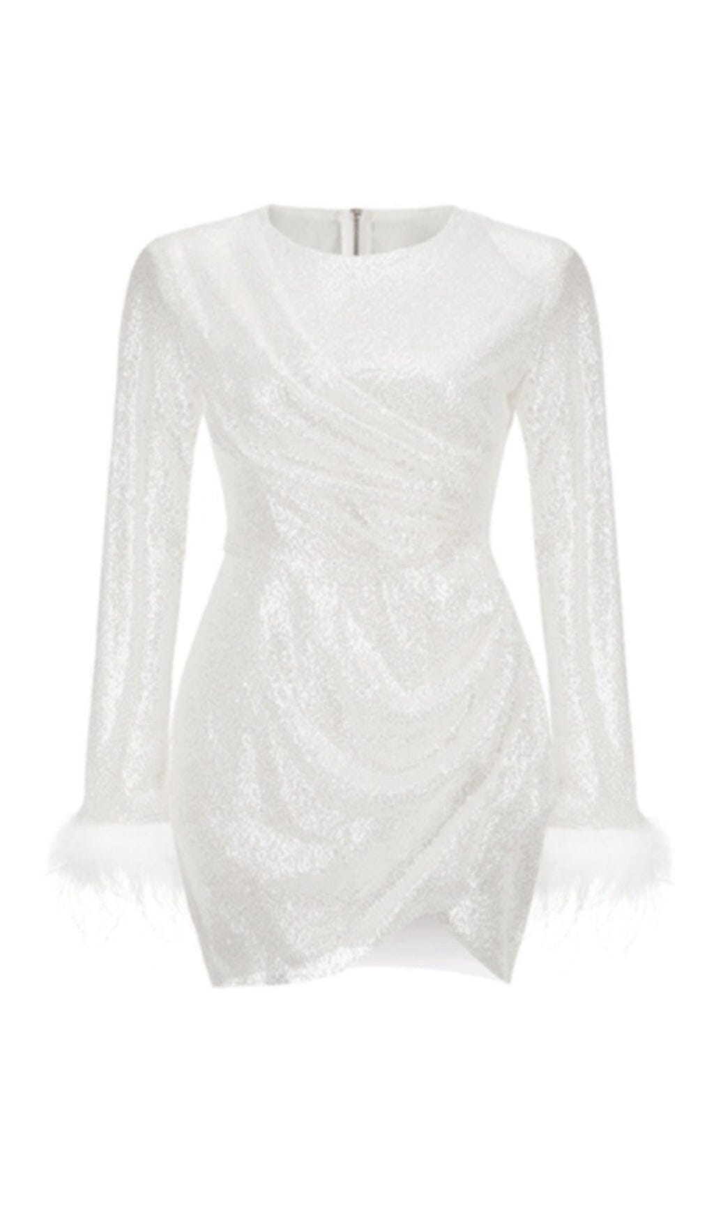 SEQUINED FEATHER MINI DRESS IN WHITE