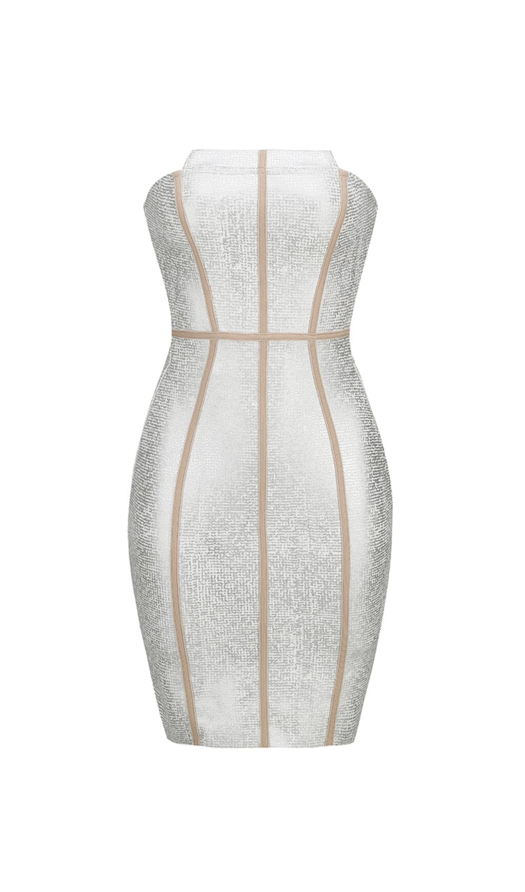This silver rhinestone-decorated bandeau miniskirt looks sexy and handsome. The bandeau design boldly shows the slender neck lines and smooth shoulders. which is sexy and charming. The white stretch fabric is decorated with silver rhinestones. which shines in the light and is very eye-catching. The simple version looks capable and handsome. and combines with the overall style with a unique charm.