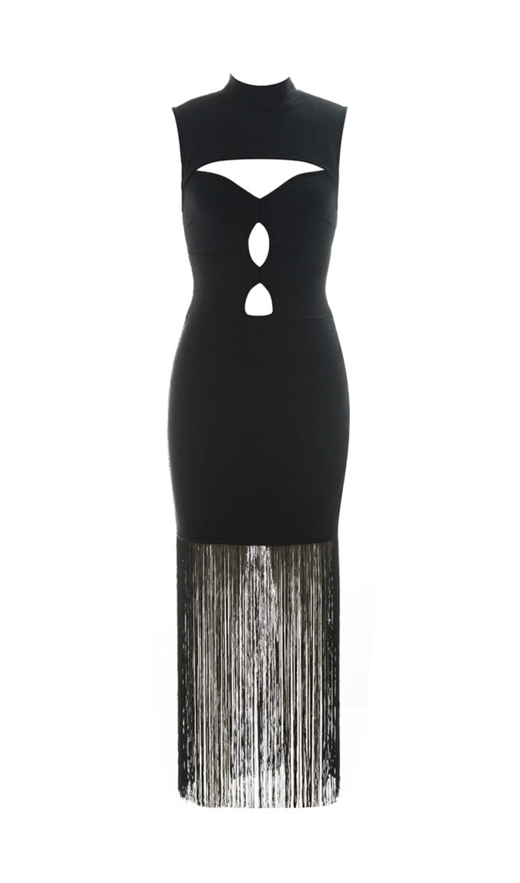 SLEEVELESS HOLLOWED OUT FRINGE DRESS IN BLACK