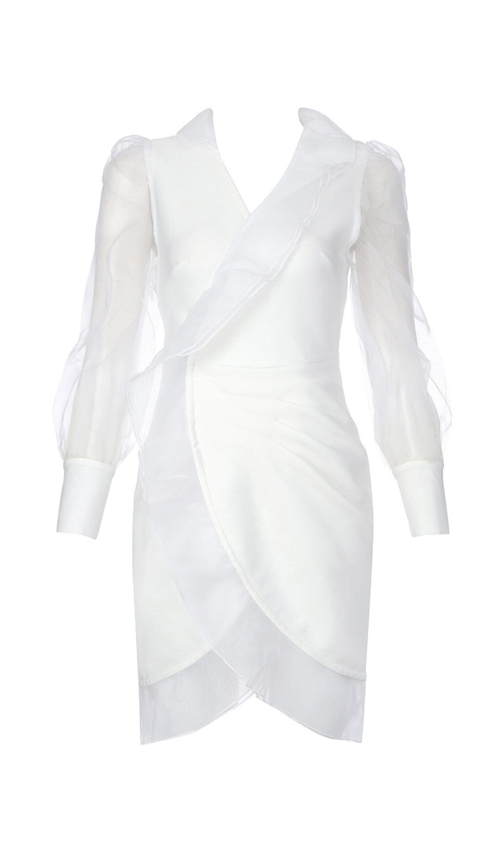 SOLID MESH LONG SLEEVE RUFFLE MINI DRESS