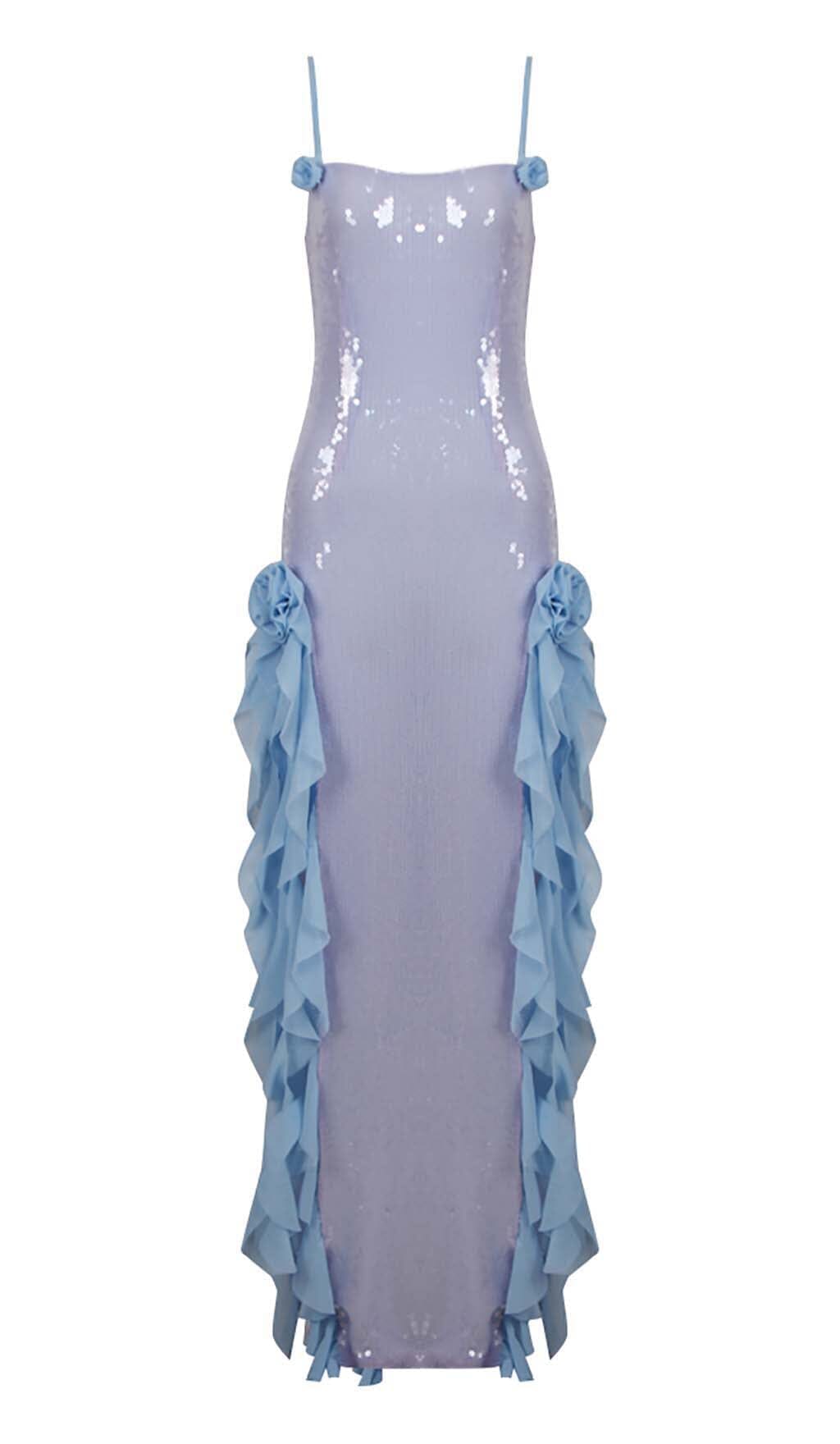 SPAGHETTI STRAP RUFFLE MAXI DRESS IN SKY BLUE