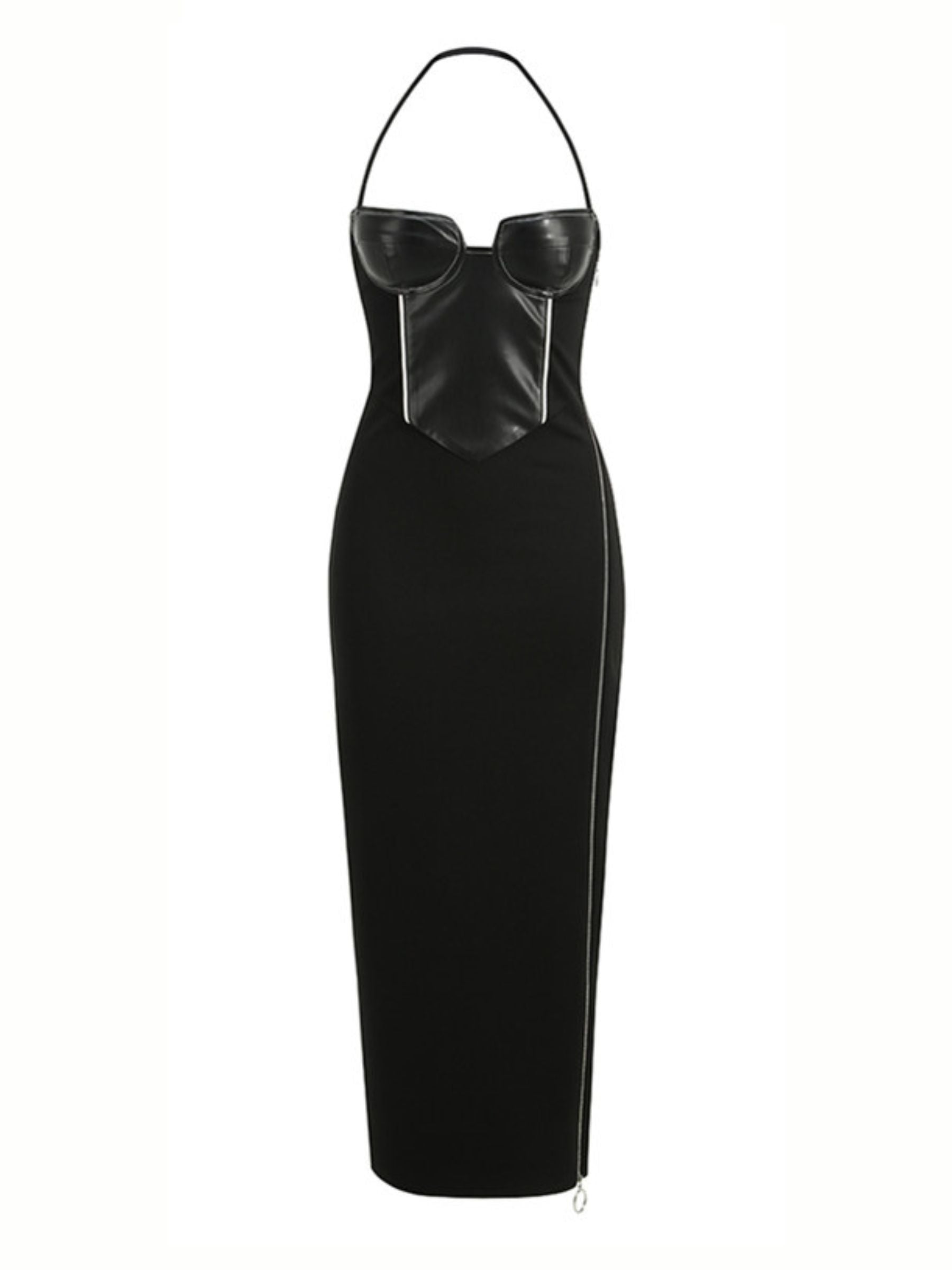 This chic faux leather midi dress features a halterneck design and a slim fit for an elegant look. Perfect for any party or cocktail event. this dress from the Izosu collection will help you stand out and embrace your inner good girl.
