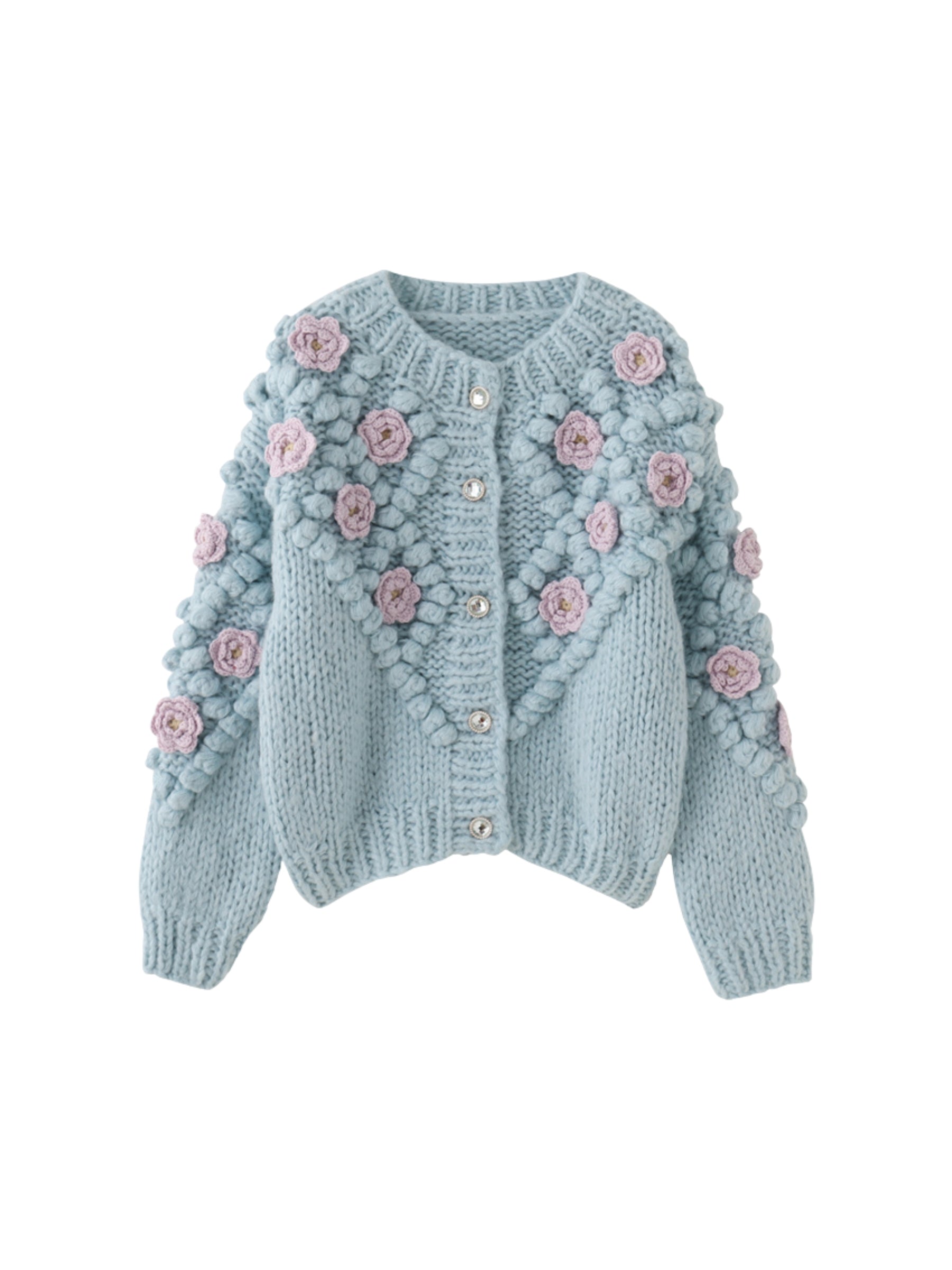 Add a touch of vintage-inspired charm to your wardrobe with our Stormie Floral Cardigan! Handmade with intricate floral embellishments. this cardigan features a soft. pastel blue base and lavender flower accents. The button-up front and pearl-style buttons add a classic touch. Stay cozy and stylish this winter with our Izosu Collection.