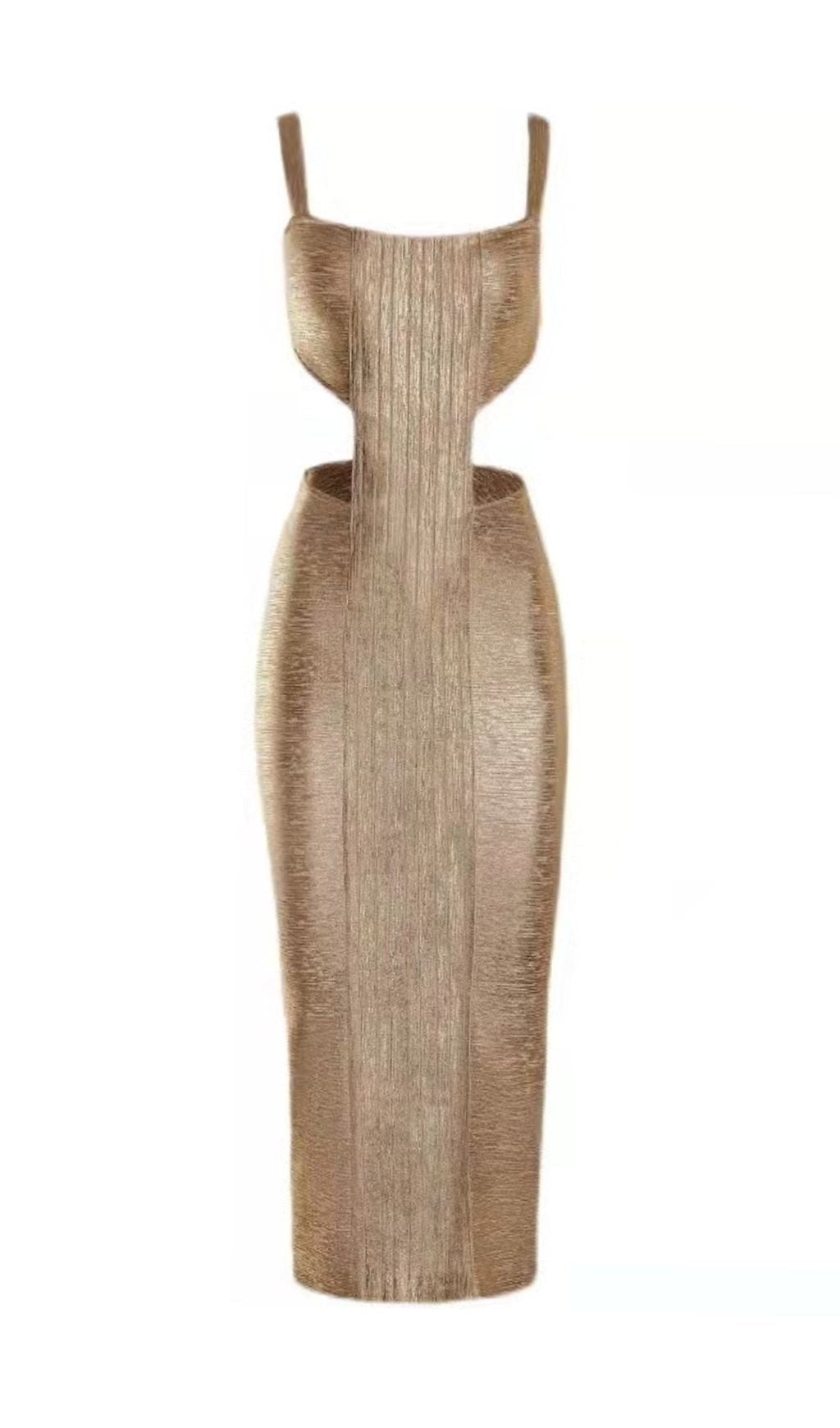 STRAPPY CUT OUT BANDAGE MIDI DRESS IN GOLD