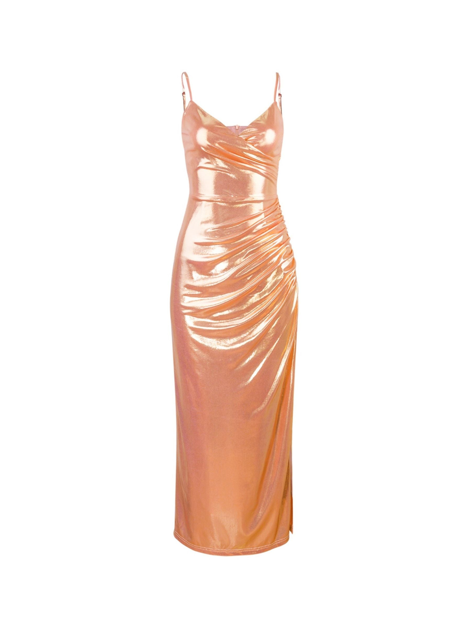 Step into the spotlight with this stunning Terra metallic champagne maxi dress. Designed with a sultry ruched detailing. this dress effortlessly hugs your curves. enhancing your silhouette. The shimmering metallic finish gives it a glamorous touch. perfect for evening events or special occasions. The spaghetti straps and side slit add a modern. daring flair.