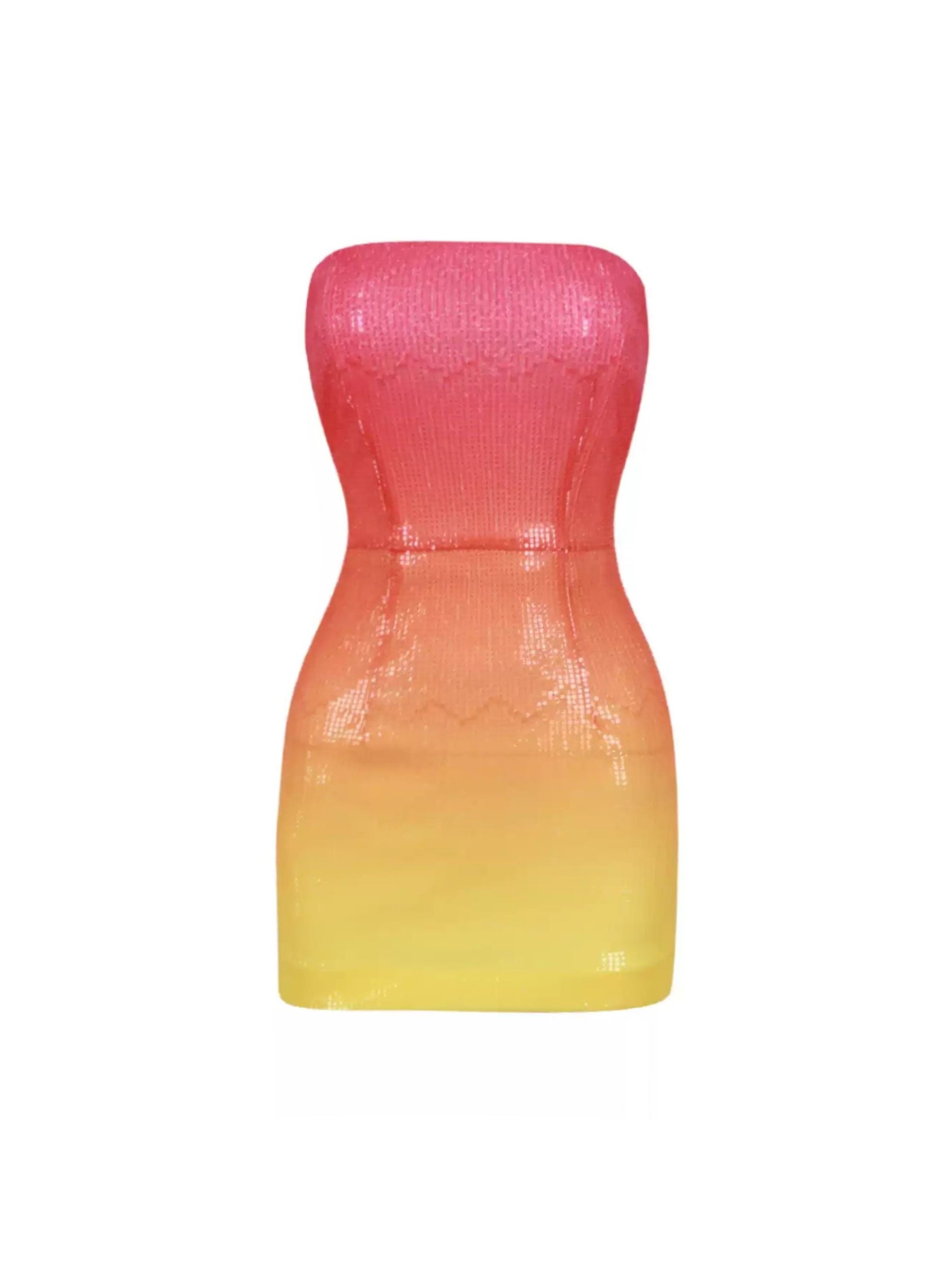 Introducing the Vaida Sunset Sequin Mini Dress. a dazzling blend of bold colors transitioning seamlessly from vibrant pink to sunny yellow. This sleeveless bodycon silhouette hugs your curves for a sleek fit. while its strapless design highlights your shoulders for an ultra-chic look. Perfect for evening events or summer parties. this gradient dress adds a pop of color to any wardrobe.