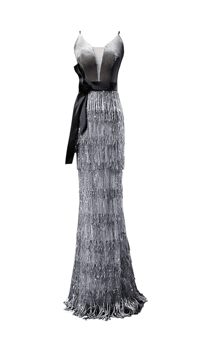 The dress as a whole is designed with spliced fringe. containing romantic elements. elegant and generous. with ruffled V-neck design. setting off the collarbone line. highlighting more elegant female temperament. so that you can show people with ease. so that you have a beautiful confidence. A black bow design is added to the waist to create a sweet and elegant girlish look. The band accentuates the waist curve and is very slimming. and the hemline is designed with an arcing trailing floor. making it even more graceful. As if a deep sea spirit. it reveals a mysterious and sexy temperament.