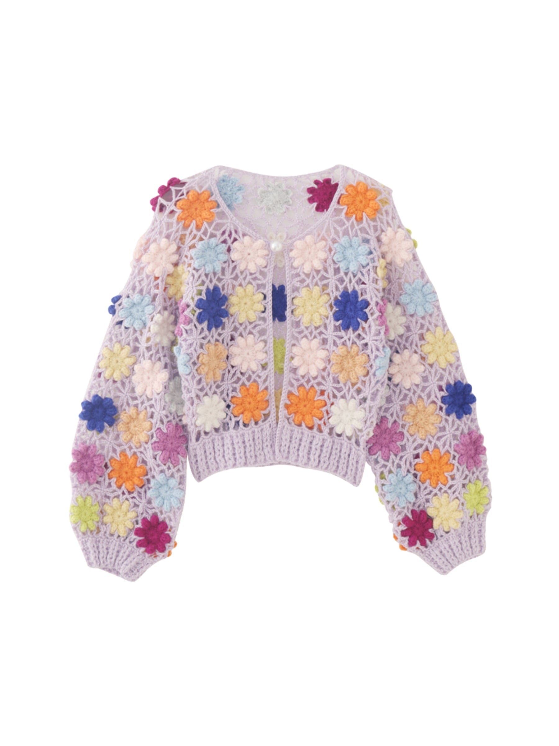 Take your style up a notch with the Wivona Crochet Cardigan. This handmade crochet design features vibrant multi-color floral embellishments and a lightweight. breathable fabric. Stand out with the button-up front and pearl accents. available in black and lavender. Perfect for layering in cooler weather from the Izosu Winter Collection.